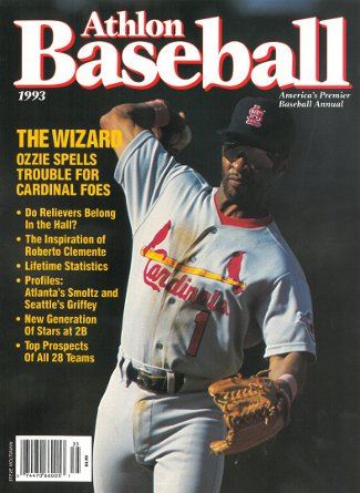 This is an Athlon Sports 1993 MLB Baseball Magazine with St. Louis Cardinals Hall of Famer Ozzie Smith on the cover. This Preview has team analysis, predictions, lineups and more for the 1993 Season