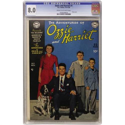<B>Ozzie and Harriet #1 (DC, 1949) CGC VF 8.0 Cream to off-white pages.</B></I> "Top of Guide" for this book is now $1,300, but as far as we know there is no NM- copy! Some call this series <B>Adventures of Ozzie and Harriet</B></I> since that's what's on the cover, and by the way, this was the only issue of the series to have a photo cover. Overstreet 2007 VF 8.0 value = $600. CGC census 6/07: 1 in 8.0, none higher.<BR><BR><b>Shipping:</b> Comics - Slabbed (certified) (<a target="_blank" href="http://www.heritageauctions.com/common/shipping.php">view shipping information</a>)
