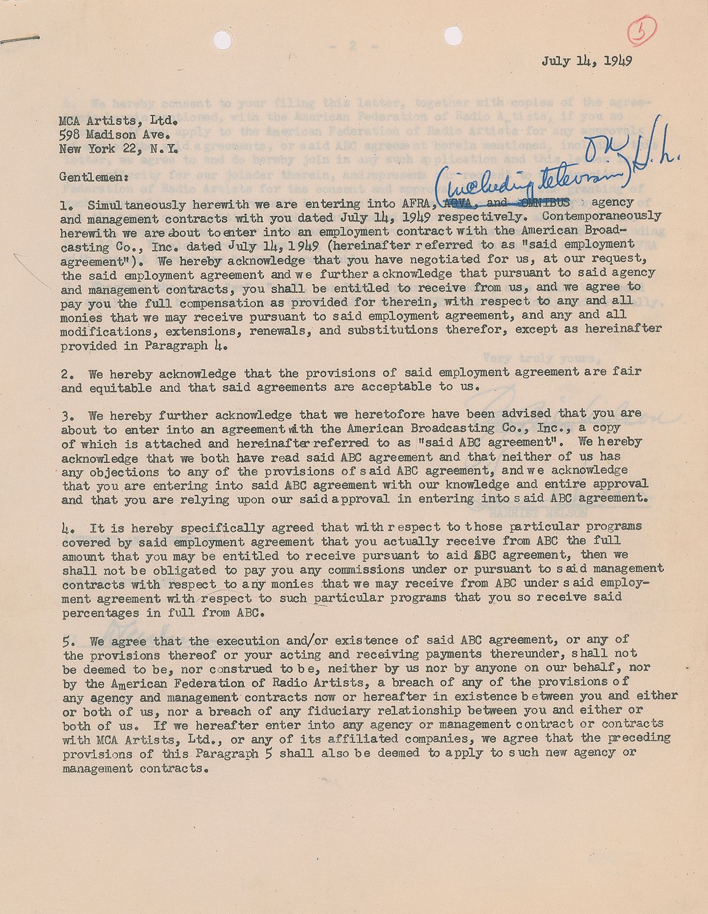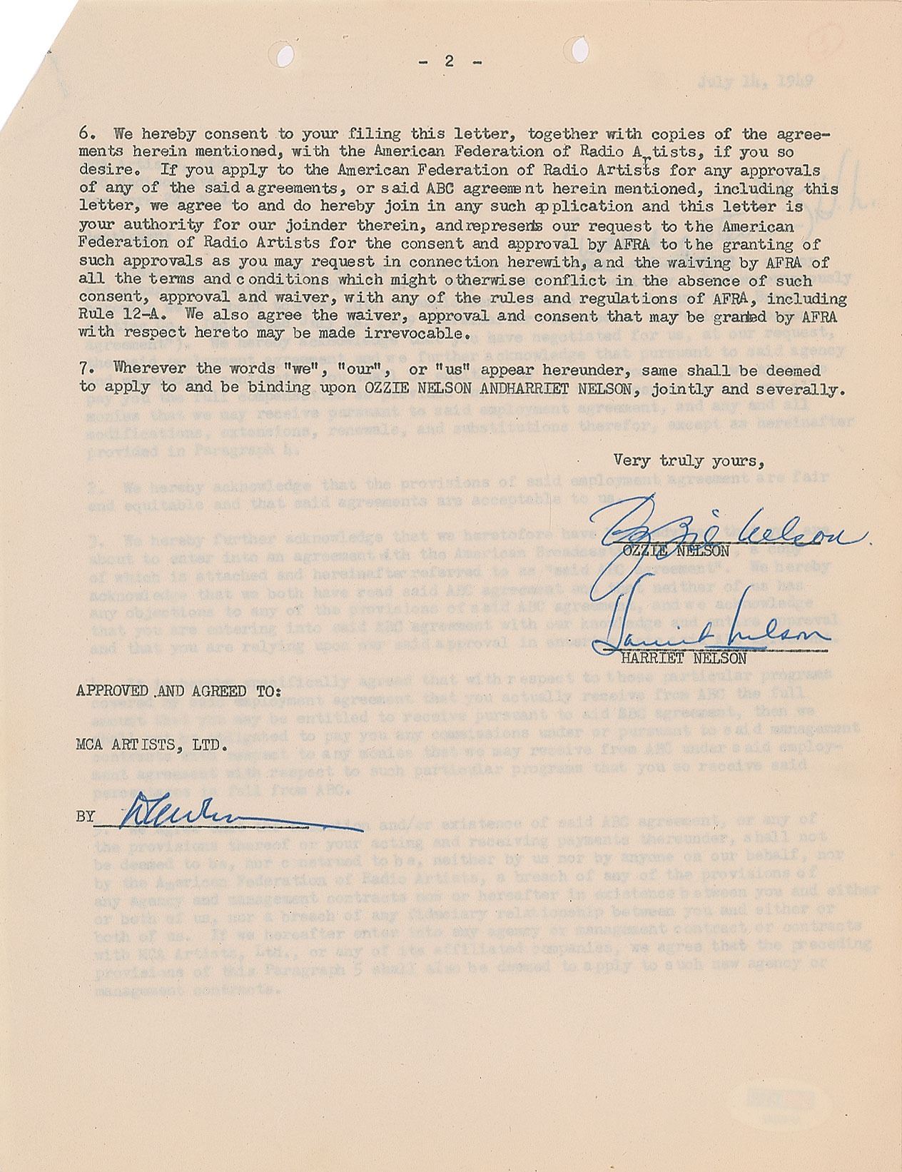 DS, two pages, 8.5 x 11, July 14, 1949. Official letter from Ozzie and Harriet Nelson addressed to MCA Artists, notifying them that they are entering into an AFRA contract and that they approve of their ensuing contract with the American Broadcasting Co., Inc. Signed at the conclusion in blue ballpoint by the husband-and-wife duo. In fine condition. Accompanied by a certificate of authenticity from PSA/DNA.