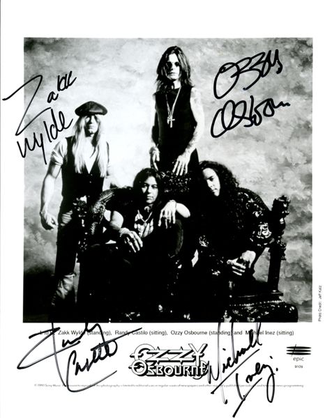 Ozzy Osbourne and his entire band signed original glossy 8x10 from 1992. Signed by Ozzy in full as well as Zakk Wylde, Randy Castilo, and Michael Inez. This item comes with a certificate of authenticity guaranteed for the life of the piece.