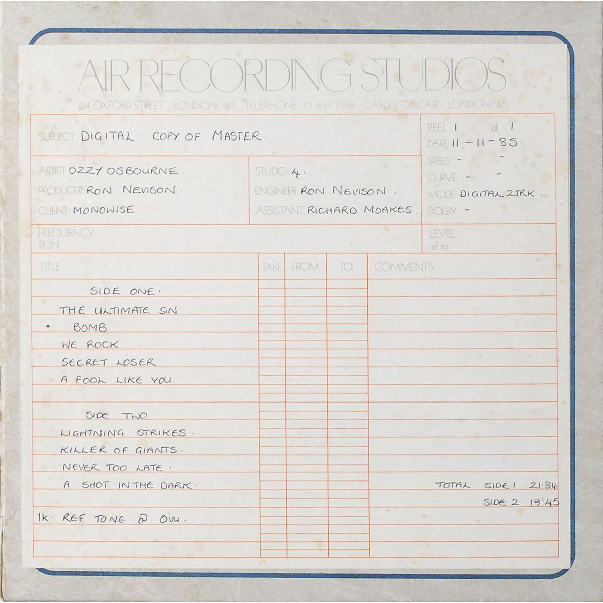 Vintage “digital copy of master” 10? tape reel of Osbourne’s 1986 album The Ultimate Sin. Affixed to the box is a large Air Recording Studios label, hand-notated with relevant information and technical data, including “Artist: Ozzy Osbourne,” “Mode: Digital 2 Trk,” listing all nine of the titles (which differ in order from the final release), and dated November 11, 1985. In overall fine condition. While this tape was mixed in November 1985, at Air Studios in London, the finalized version was actually mixed the following month at Record Plant Recording Studios in LA, rendering this particular version unique. The album would eventually be certified double platinum by the RIAA. Originates from the personal collection of legendary engineer and producer Ron Nevison.