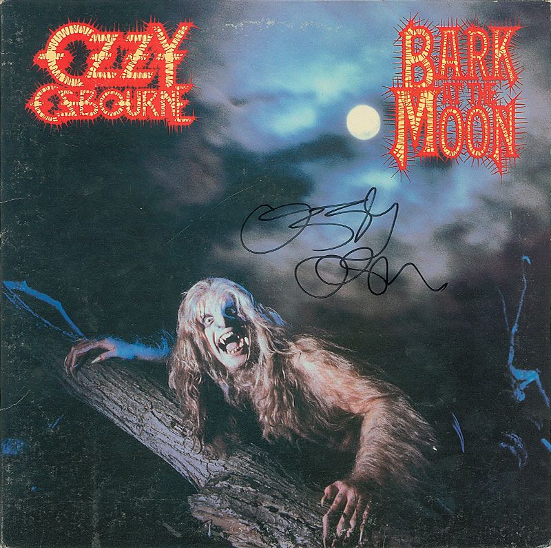 Bark at the Moon album signed on the front cover in black felt tip. Scattered light cover and edge wear, otherwise fine condition. The record is included.