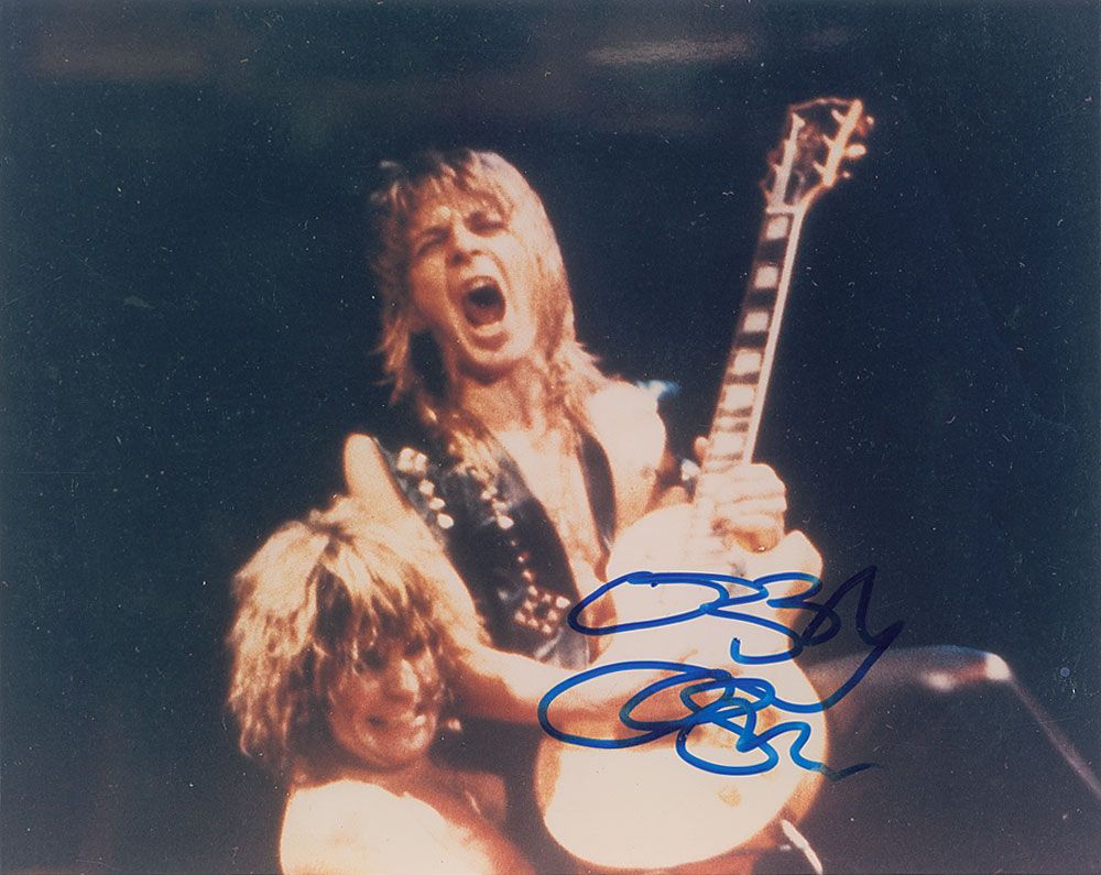 Color glossy 10 x 8 photo of Ozzy lifting up Randy Rhoads on stage, signed in person in blue felt tip. In very fine condition. Originally obtained by in-person specialist Mike Wehrmann.