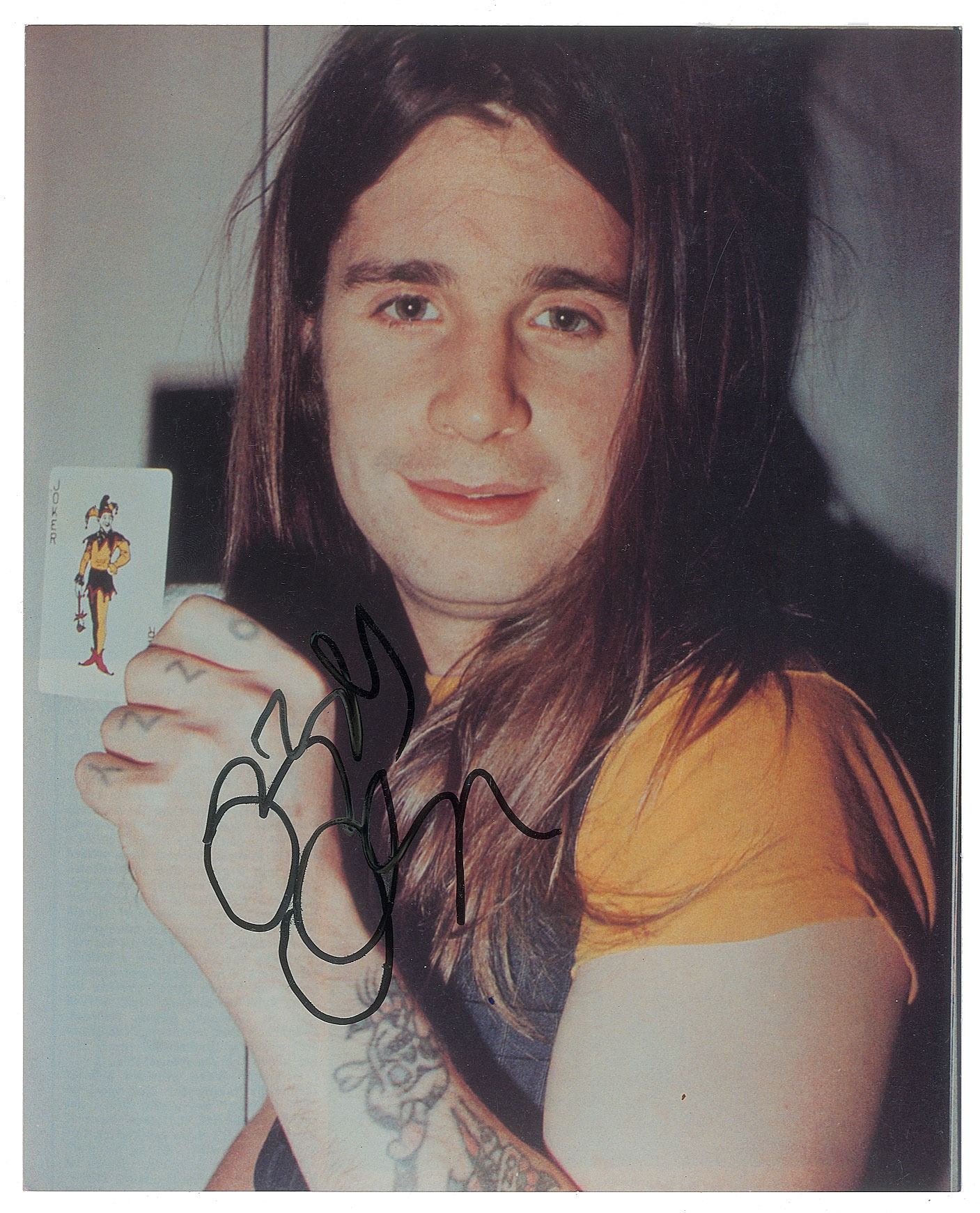 Two color glossy 8 x 10 photos signed by Osbourne: one showing the Black Sabbath frontman holding a joker playing card, signed in black felt tip; and one showing him in a flamboyant costume, signed in blue felt tip. In overall fine condition.