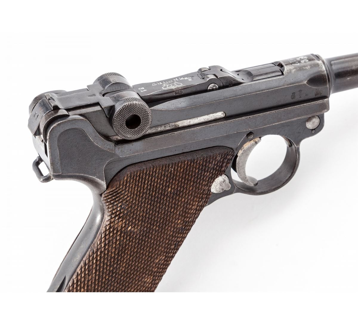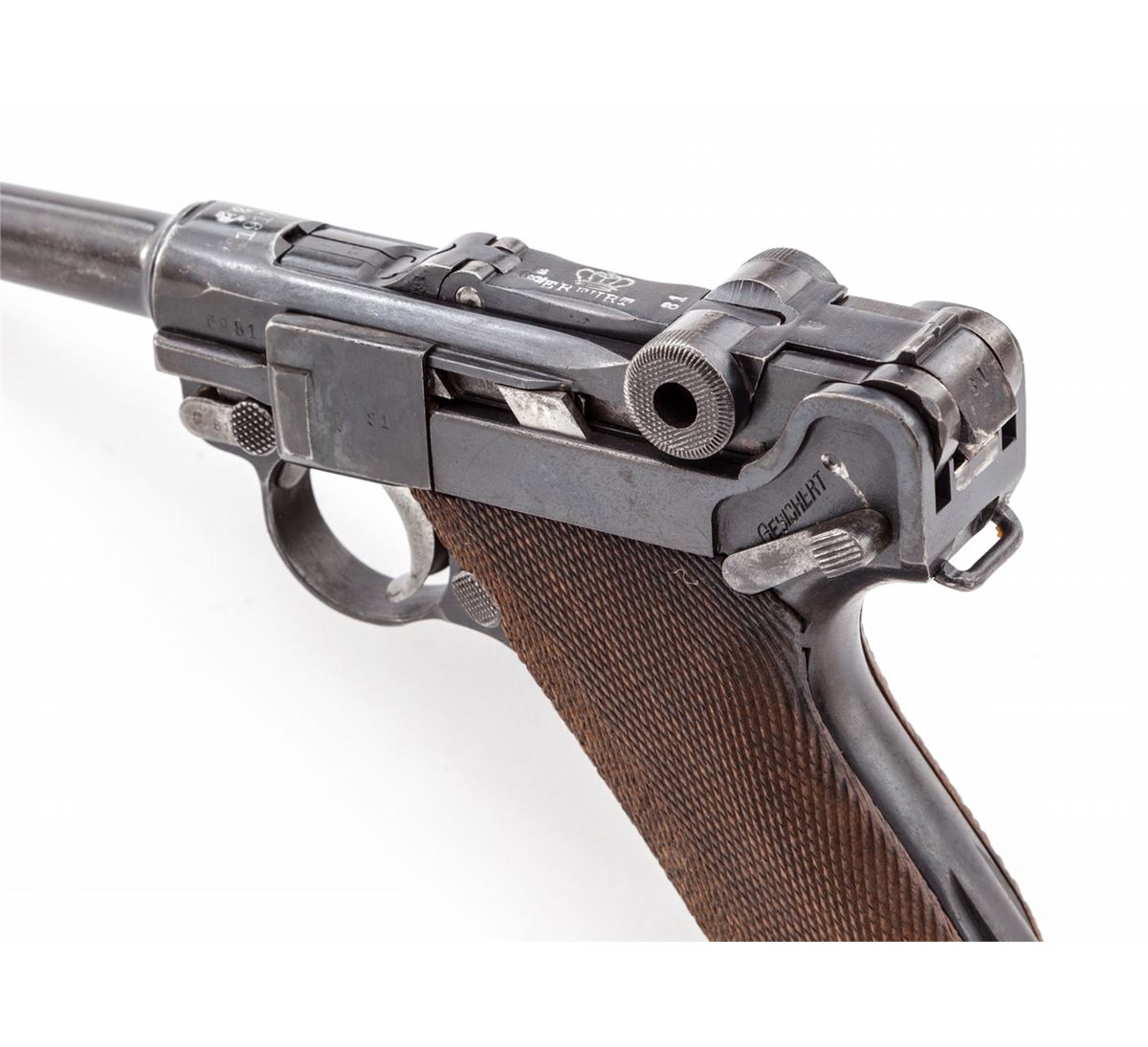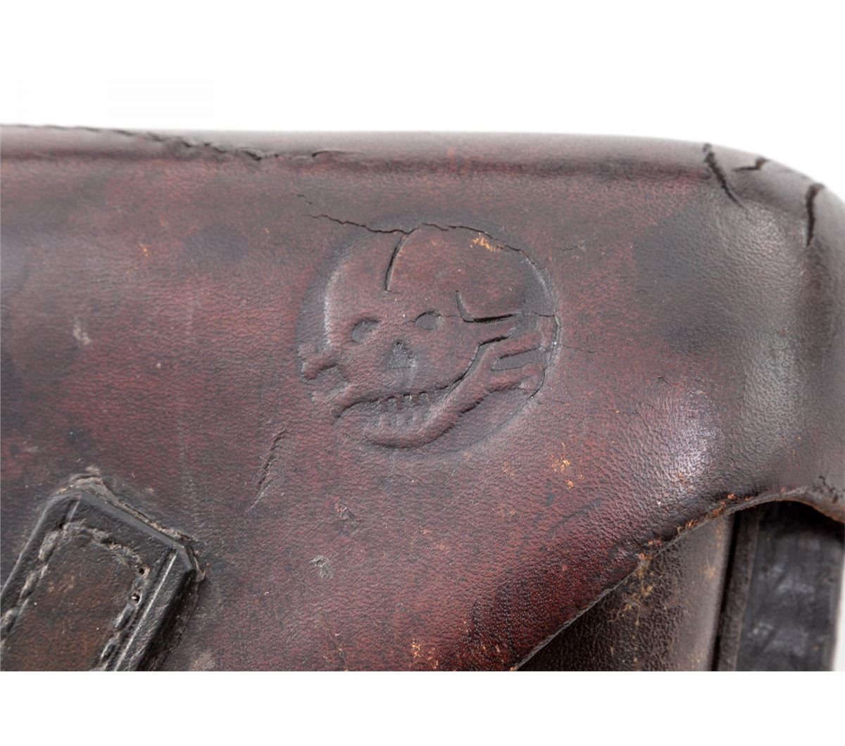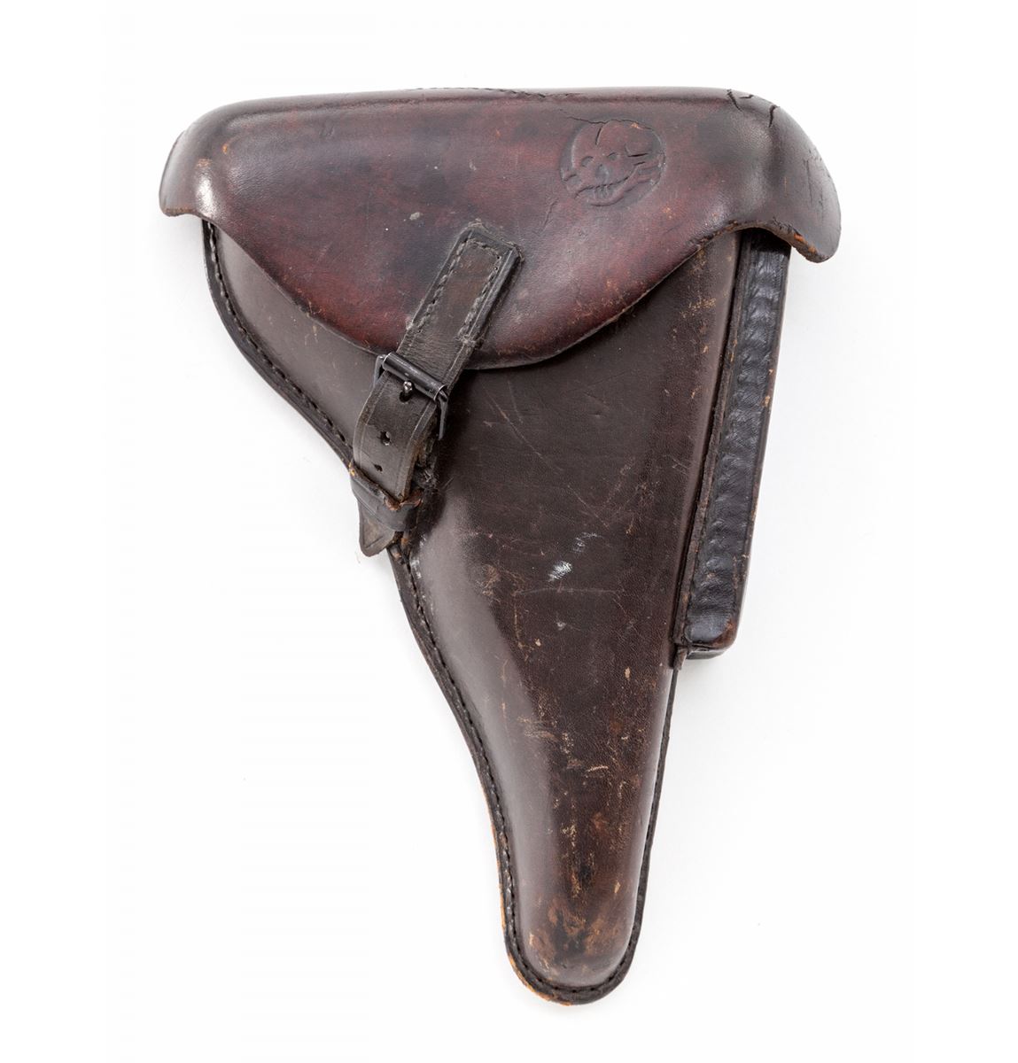 P.08 Death's Head Rework Luger Semi-Automatic Pistol, by Erfurt, with Death's Head marked holster, #6981k, 9mm, 4'' barrel, blue finish, straw small parts, checkered walnut grips, with one blank and one mismatched magazine. Holster an unmarked WWI variation and embossed with Death's Head markings. Safety is marked ''Gesichert'', extractor marked ''Geladen'', toggle marked ''Erfurt'', chamber marked with Death's Head over 1917. Pistol shows several commercial nitro-proofmarks and all visible serial numbers match. There are several theories to the Death's Head reworks. Possibly, but doubtful, a WWI unit marking. Secondly, that these pistols were obtained post-WWI by the Freikorp, a group of WWI veterans who came together to drink beer, fight Communism, and generally do as they pleased. The last theory is that the Death's Head reworks were done in the early or pre-Nazi era for SS use. Both the chamber marking and the applied marking to the holster are known as ''Lazy S Totenkopf'', and they have only been otherwise noted on reworked WWI Gewehr 98 rifles, but not on the WWII era rifles, helping to further nail the period down as pre-1934. We believe this particular example to be completely correct and original, as it is very consistent with other known examples. Condition is fine as reworked and retaining approx. 85%-90% of the original and reworked blue finish. Straw parts show thinning, toning and wear, as do the high edges of sideplate and the area near muzzle. Grips with light to just moderate flattening of checks. Action is crisp, bore shows only light pitting in the grooves. Holster remains in very good condition as inter-war dyed and replacement strap, with good stitching that has been dyed dark as well. Est.: $2,500-$3,500. (C&R)