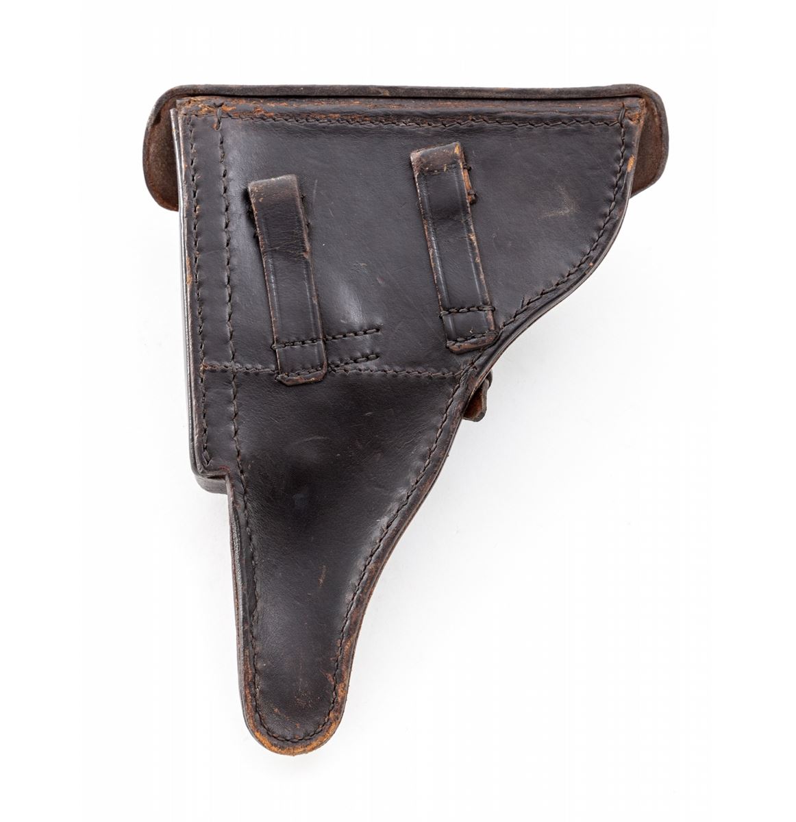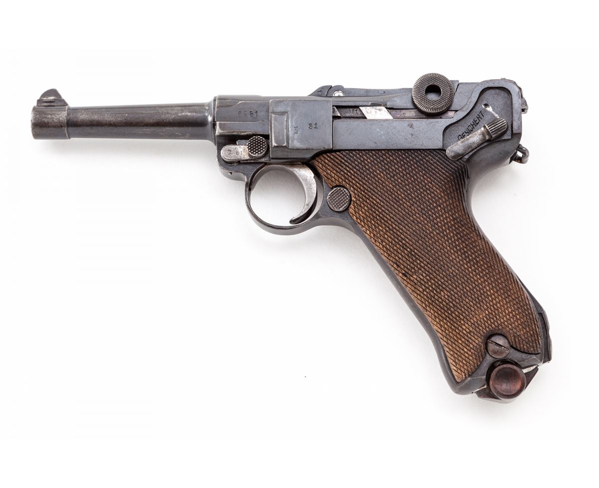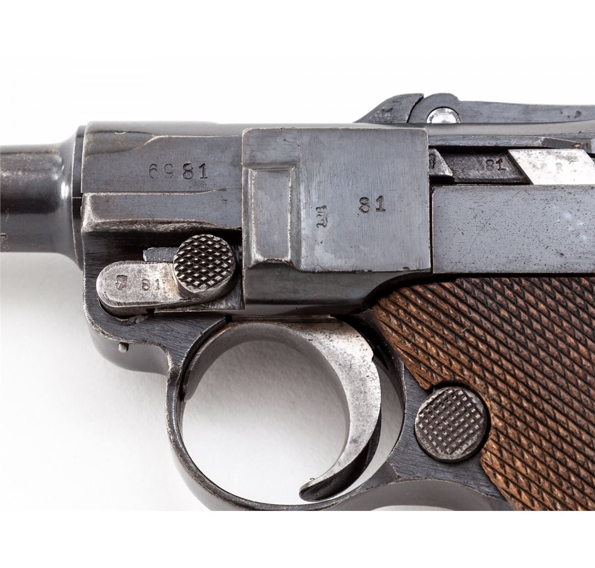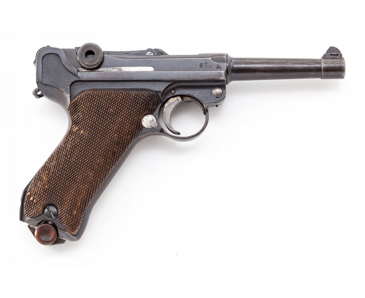 P.08 Death's Head Rework Luger Semi-Automatic Pistol, by Erfurt, with Death's Head marked holster, #6981k, 9mm, 4'' barrel, blue finish, straw small parts, checkered walnut grips, with one blank and one mismatched magazine. Holster an unmarked WWI variation and embossed with Death's Head markings. Safety is marked ''Gesichert'', extractor marked ''Geladen'', toggle marked ''Erfurt'', chamber marked with Death's Head over 1917. Pistol shows several commercial nitro-proofmarks and all visible serial numbers match. There are several theories to the Death's Head reworks. Possibly, but doubtful, a WWI unit marking. Secondly, that these pistols were obtained post-WWI by the Freikorp, a group of WWI veterans who came together to drink beer, fight Communism, and generally do as they pleased. The last theory is that the Death's Head reworks were done in the early or pre-Nazi era for SS use. Both the chamber marking and the applied marking to the holster are known as ''Lazy S Totenkopf'', and they have only been otherwise noted on reworked WWI Gewehr 98 rifles, but not on the WWII era rifles, helping to further nail the period down as pre-1934. We believe this particular example to be completely correct and original, as it is very consistent with other known examples. Condition is fine as reworked and retaining approx. 85%-90% of the original and reworked blue finish. Straw parts show thinning, toning and wear, as do the high edges of sideplate and the area near muzzle. Grips with light to just moderate flattening of checks. Action is crisp, bore shows only light pitting in the grooves. Holster remains in very good condition as inter-war dyed and replacement strap, with good stitching that has been dyed dark as well. Est.: $2,500-$3,500. (C&R)