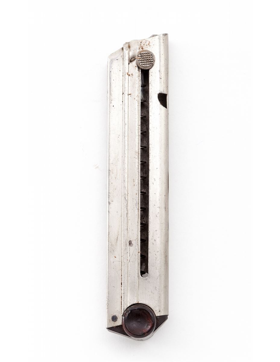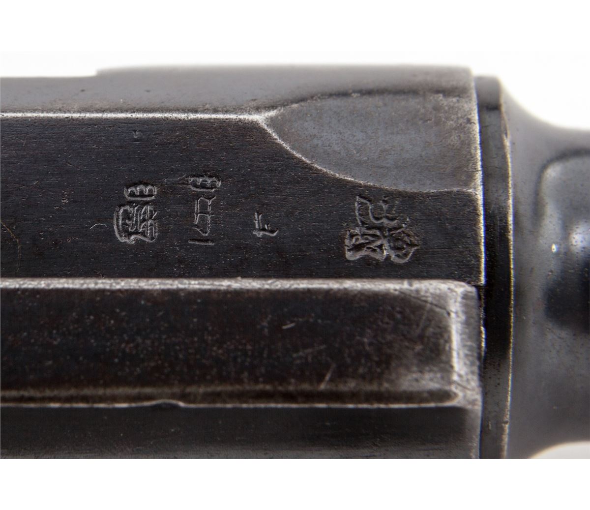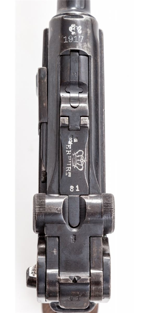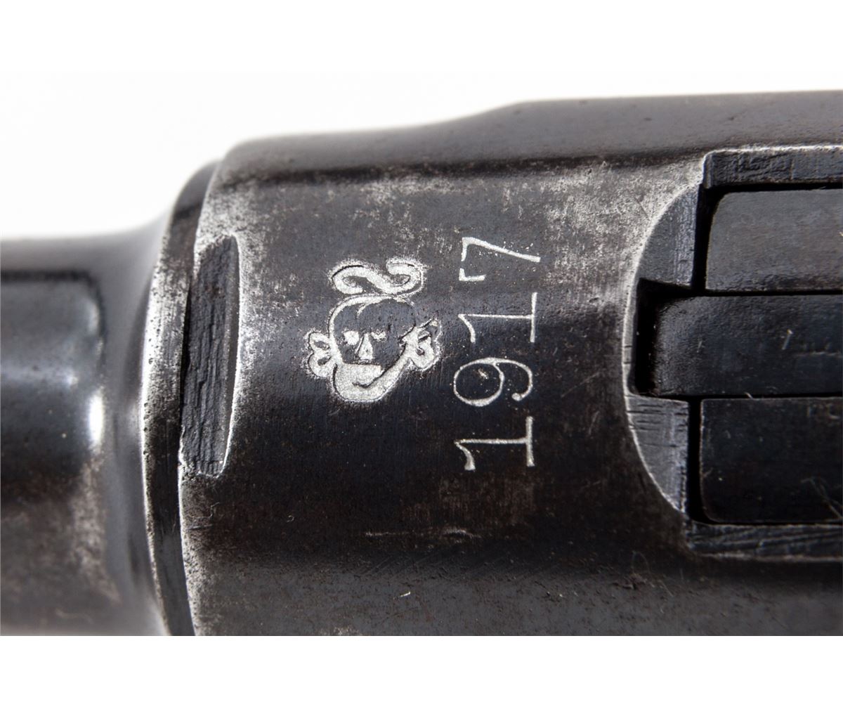 P.08 Death's Head Rework Luger Semi-Automatic Pistol, by Erfurt, with Death's Head marked holster, #6981k, 9mm, 4'' barrel, blue finish, straw small parts, checkered walnut grips, with one blank and one mismatched magazine. Holster an unmarked WWI variation and embossed with Death's Head markings. Safety is marked ''Gesichert'', extractor marked ''Geladen'', toggle marked ''Erfurt'', chamber marked with Death's Head over 1917. Pistol shows several commercial nitro-proofmarks and all visible serial numbers match. There are several theories to the Death's Head reworks. Possibly, but doubtful, a WWI unit marking. Secondly, that these pistols were obtained post-WWI by the Freikorp, a group of WWI veterans who came together to drink beer, fight Communism, and generally do as they pleased. The last theory is that the Death's Head reworks were done in the early or pre-Nazi era for SS use. Both the chamber marking and the applied marking to the holster are known as ''Lazy S Totenkopf'', and they have only been otherwise noted on reworked WWI Gewehr 98 rifles, but not on the WWII era rifles, helping to further nail the period down as pre-1934. We believe this particular example to be completely correct and original, as it is very consistent with other known examples. Condition is fine as reworked and retaining approx. 85%-90% of the original and reworked blue finish. Straw parts show thinning, toning and wear, as do the high edges of sideplate and the area near muzzle. Grips with light to just moderate flattening of checks. Action is crisp, bore shows only light pitting in the grooves. Holster remains in very good condition as inter-war dyed and replacement strap, with good stitching that has been dyed dark as well. Est.: $2,500-$3,500. (C&R)