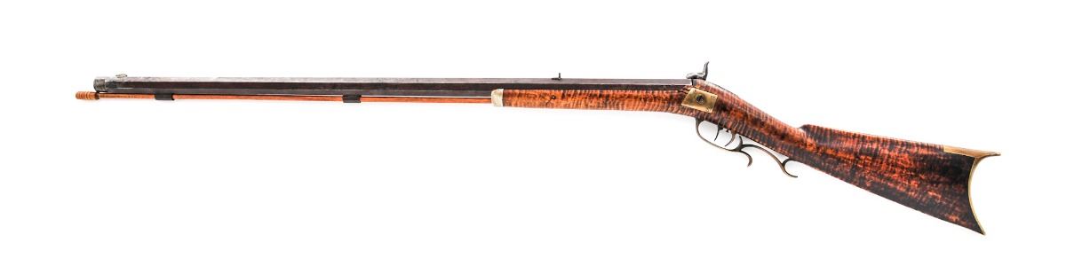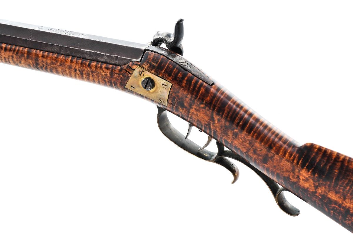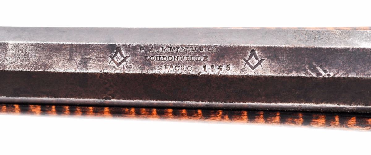 P.A. Reinhard marked Single Shot Percussion Rifle, NVSN, approx. .38 cal., 33'' barrel, brown finish, adjustable double set triggers, drum style bolster, lightly engraved hammer, halfstock tiger maple stock, with dovetailed German silver blade front sight and fixed iron rear sights.  Top barrel flat is marked ''P.A. REINHARD LOUDONVILLE/ASHD CO. O 1865''; lock is engraved with a floral motif and marked ''Conestoga Works''.  Condition is very good.  Brass triggerguard with finger and grip extension, wooden ramrod and mounted with a nice tiger stripe maple halfstock with German silver forend cap and brass crescent buttplate.  Stock is repaired with a brass reinforcement at stock crossbolt.  Est.:  $500-$900.  (Antique)