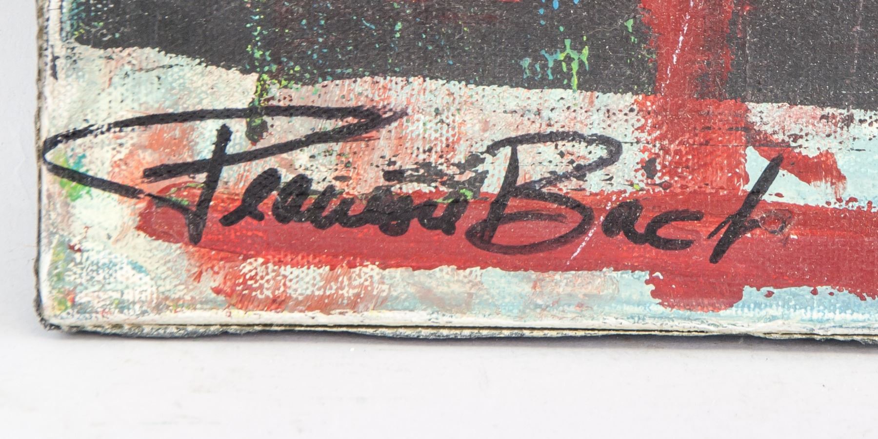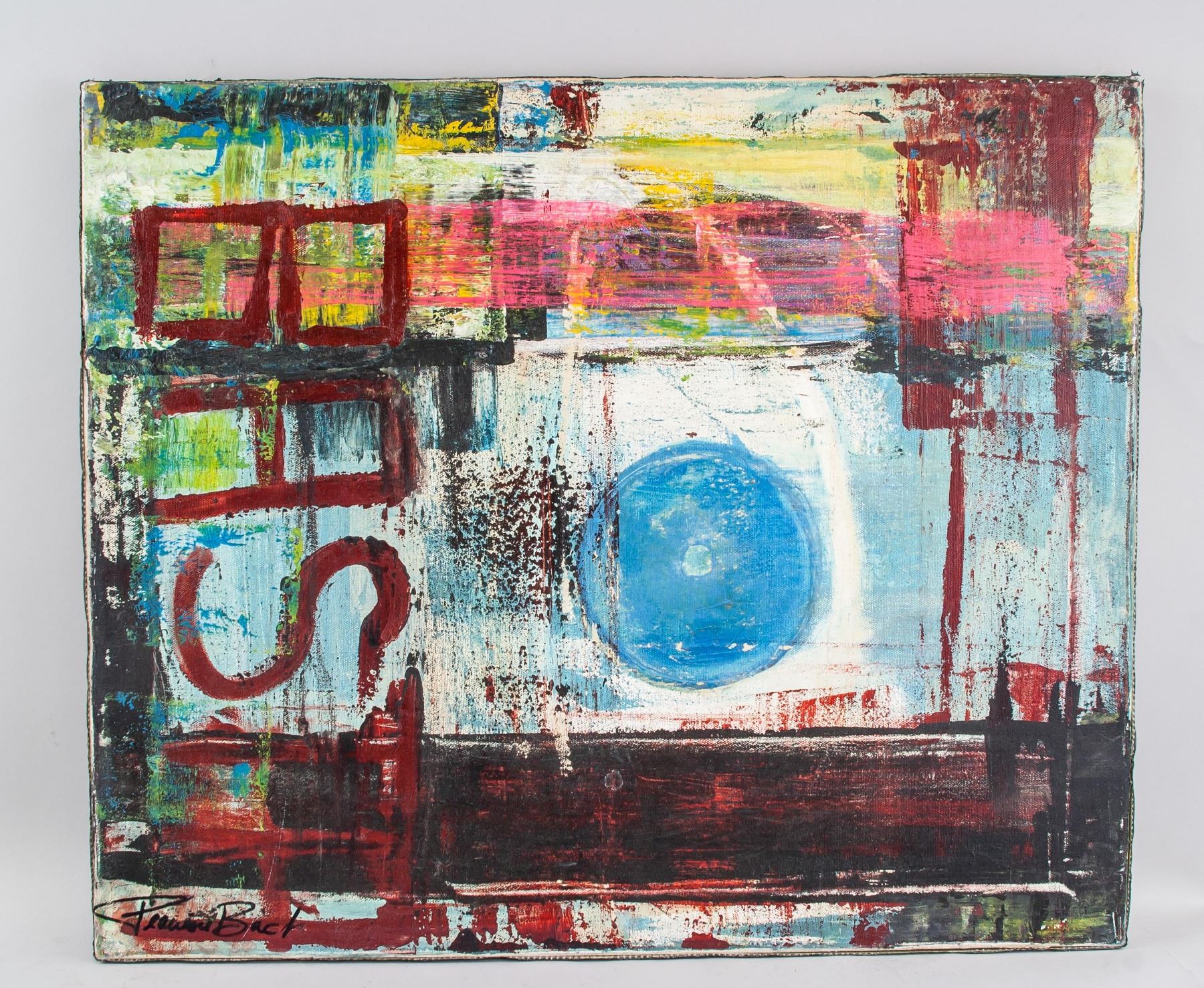 Oil on canvas. Featuring abstract composition and enttied, "BASTA" (That is Enough!). Signed LL and attr. P. Beck. 24 x 20 in. (61 x 51 cm)