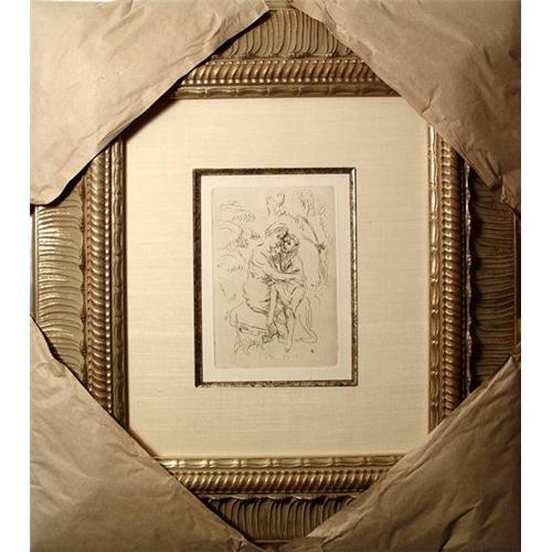 PIERRE BONNARD (French, 1867-1947), dated 1930.<p> Authentic Etching<p> Signature: Artists initials in the plate, from the hand of Bonnard, as issued.<p> Full Sheet Size: 10 x 12.75<p>Expensive Custom Frame, 4 ornate wood molding, linen matting, wood fillet under UV protective glass. Full Frame Size: 24 x 22 <p> Published Date: 1930<p> CATALOGUE REFERENCE: Bonnard, The Complete Graphic Work by Francis Bouvet.<p> Authenticity is GUARANTEED.<p> Paper: Arches laid, back light reveals the authenticity of paper.<p> Edition: First Original Edition<p> Edition Size: 275<p> Condition: very good.<p> Margins: Full, as issued.<p> Etching - An intaglio printing process in which an etching needle is used to draw into a wax ground applied over a metal plate. The plate is then submerged in a series of acid baths, each biting into the metal surface only where unprotected by the ground. The ground is removed, ink is forced into the etched depressions, the un etched surfaces wiped, and an impression is printed. Also, both the design etched on a plate and an impression made from an etched plate. Too often confused with engraving. <p>Shipping and insurance are determined after checkout. <p><P> Rare Cezanne Authentic 1914 Engraving on Velin - This is NOT an offset copy or re-strike edition! Paul Cezanne b.1839 Helioengrave, titled ' Dans le jardin, dessin au crayon ' with tissue guard with printed title!