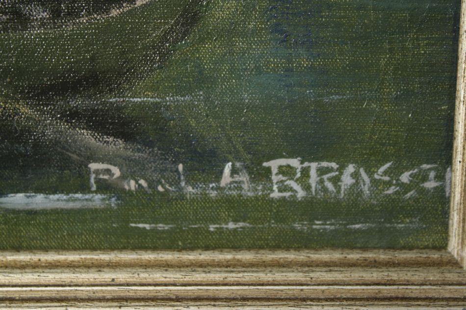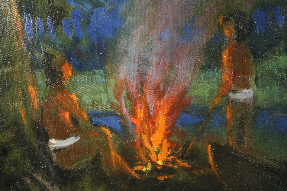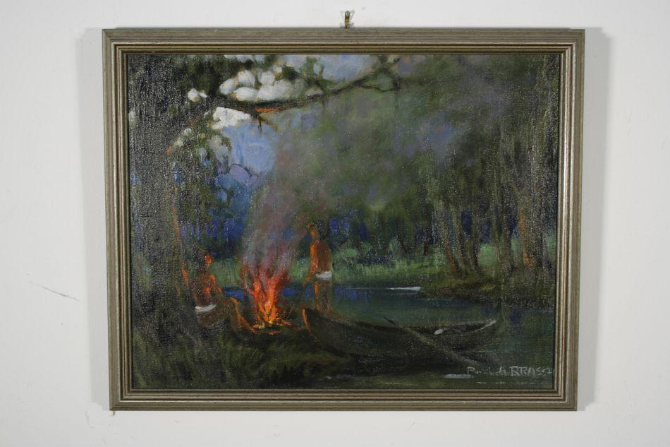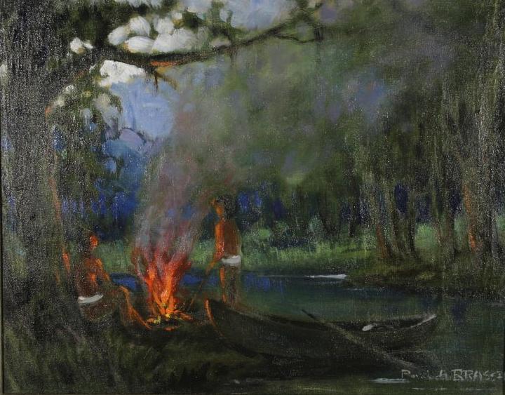 P. Brassin (20th Century) American Indians Landscape Lighting Fire, Oil on canvas,