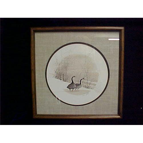 P. Buckley Moss' talent for acquainting us with wildlife and encouraging relationships with her art is indelible. "Cameo Geese" captures the devotion of this mated pair of Canadian geese. Print #996 of 1000. Signed. Code #0102149106. Minor scratches on walnut frame. Comes with original paperwork and acid-free mounting.