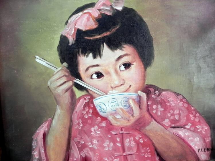 We are offering this signed piece by the artist P.C. Chen. It is an oil on board of a young girl eating rice, and it is nicely framed in a wooden frame. ---Artist: P.C. Chen -Medium: Oil on Board -Image Size: 15.75" x 11.5" -Frame Size: 20" x 16" -Image Condition: Excellent -Frame Condition: Good, Some Wear and Scratches
