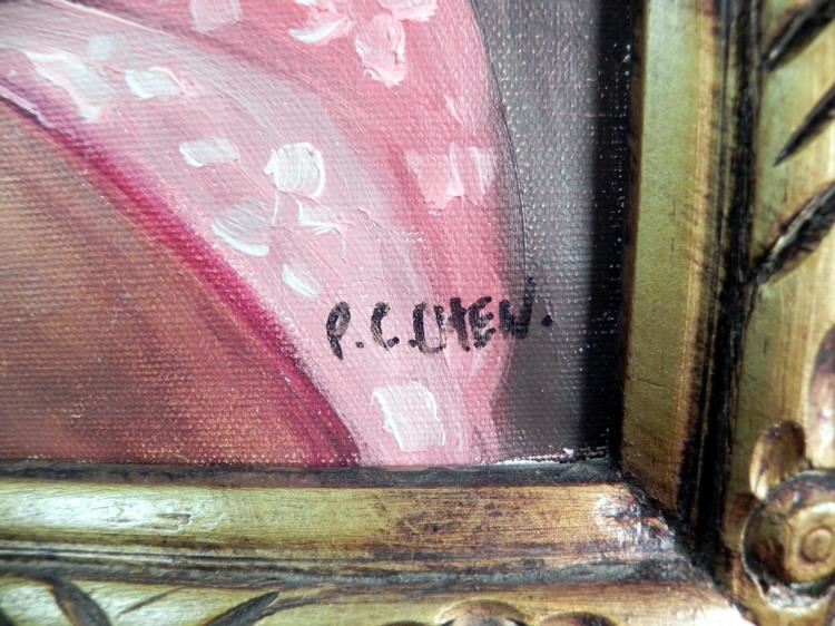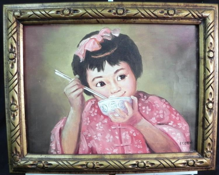 We are offering this signed piece by the artist P.C. Chen. It is an oil on board of a young girl eating rice, and it is nicely framed in a wooden frame. ---Artist: P.C. Chen -Medium: Oil on Board -Image Size: 15.75" x 11.5" -Frame Size: 20" x 16" -Image Condition: Excellent -Frame Condition: Good, Some Wear and Scratches