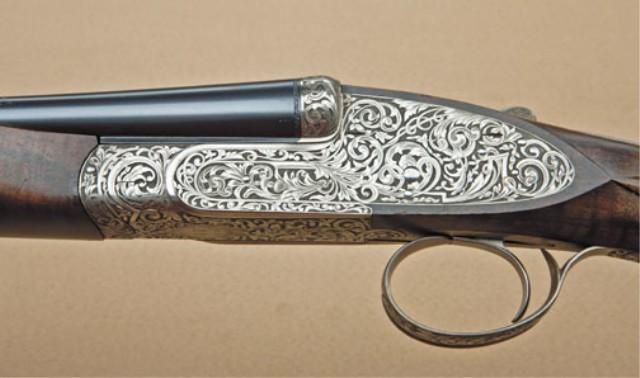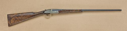 P. Constantine full side-lock 410ga shotgun, ornately scroll engraved, select walnut plain uncheckered stock, with single trigger, auto ejector. The gun measures 45” overall with 27” barrels choked extra full and extra full, and weighs 5.8lbs. The engraving is signed Golosio and is master’s quality showing deeply cut flowing scrolls with portrait of demon at bottom center of frame. The gun shows satin finished burl walnut with wraparound forend and no checkering at wrist forend, or butt. The barrels are marked Katsenes, Santa Monica, who operated as London Guns and imported these high-grade London arms about 20 years ago. The gun shows raised milled rib and finest quality workmanship throughout. Serial #5820. Est: $7,000 - $14,000