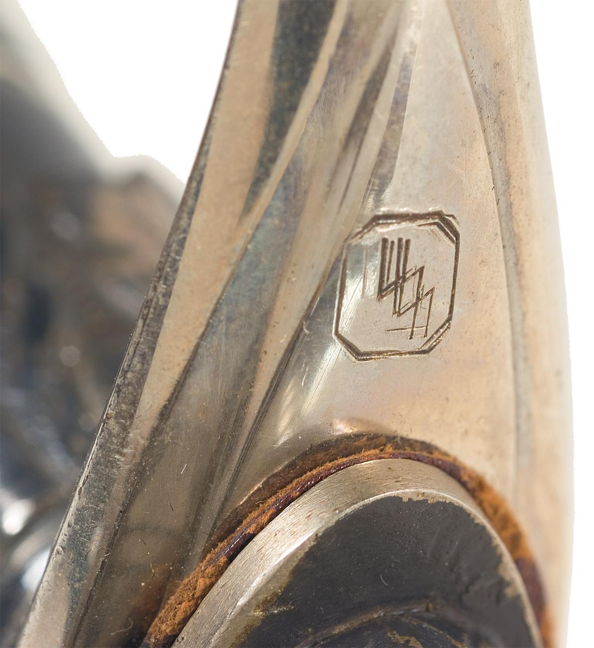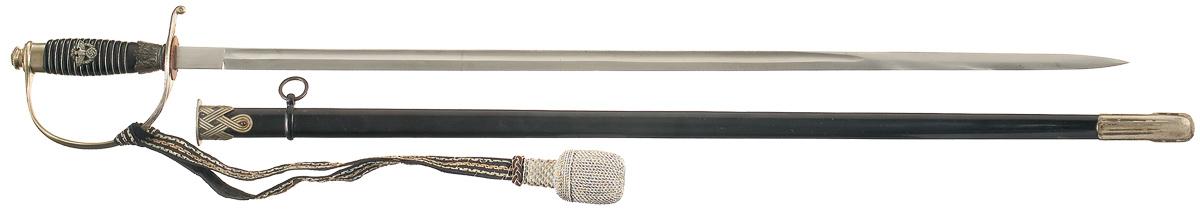 31 inch single fuller straight edge blade, with the Solingen makers mark on the left ricasso. Nickel finished hilt with "SS" proofed guard, oak leaf collar and wire ribbed grip with the police icon on the right side. Black cloth portapee with silver wire, orange cord and a silver acorn. Black enamel sheath with nickel tip and throat, "SS" proofed throat and single hanging ring. Reportedly owned by a SS officer who was hung after the Nuremburg trials.