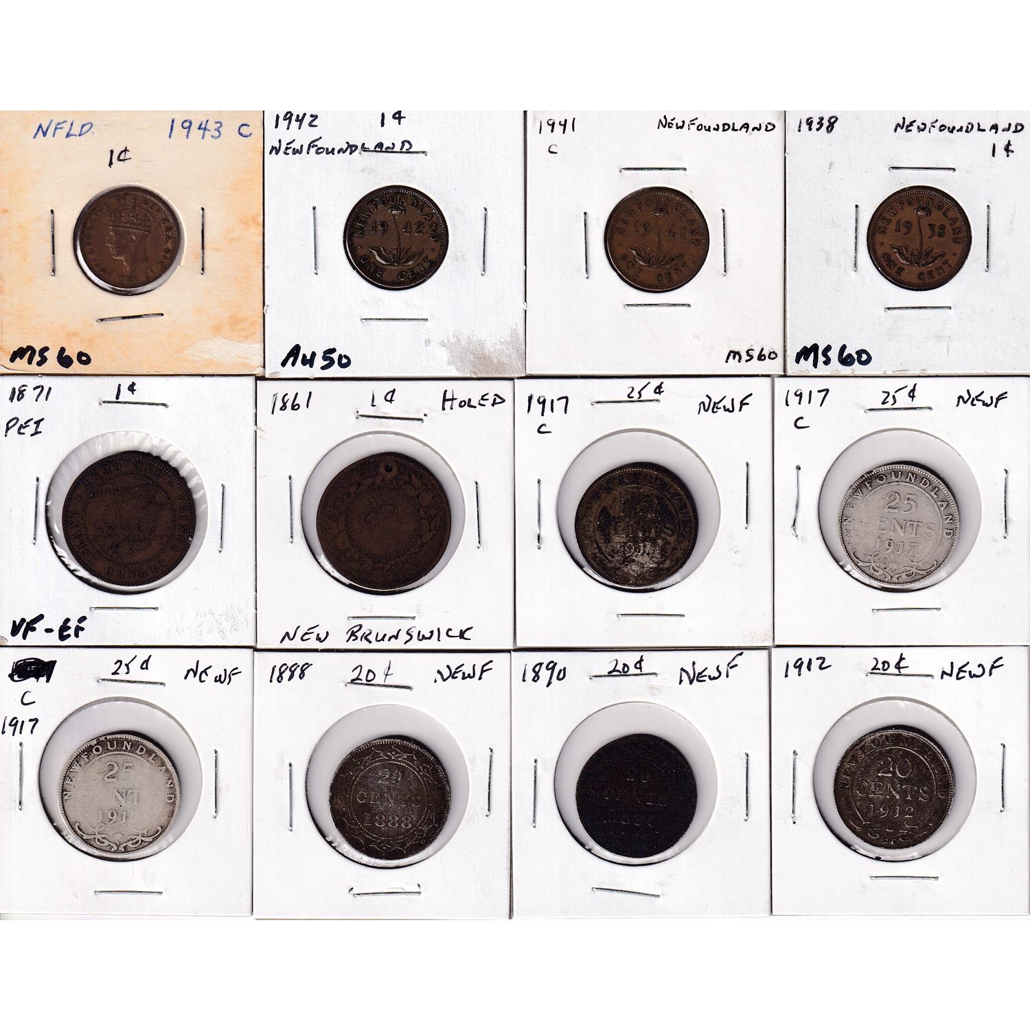 P.E.I. & Newfoundland 1-cent - 1871 P.E.I. & 1938, 1941C & 1943C Newfoundland, 1861 New Brunswick 1-cent (holed), 3x 1917C Newfoundland 25-cents and 1888, 1890 & 1912 Newfoundland 20-cent. 12pcs