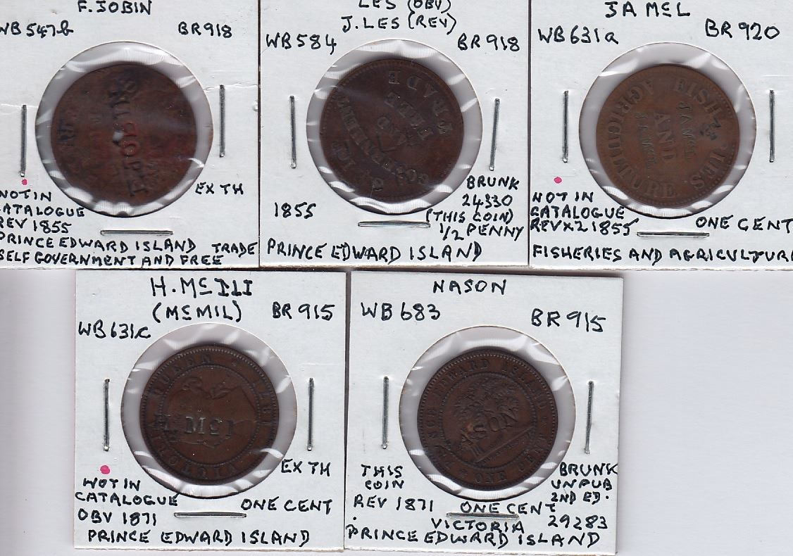 F. JOBIN on rev. of Prince Edward’s Island ½ penny (square hole in center), 1855, Br 918 (Brunk J-121); LES on obv. and J LES, with another undetermined mark below, on rev. of Prince Edward’s Island ½ penny, 1855, Br 918 (M.I. 584, Brunk L-295); J.A. McL twice on rev. of Fisheries and Agriculture cent, 1855, Br 920 (Brunk M-486); H. McM__ on obv. of Prince Edward Island cent, 1871, Br 915; (?) NASON on rev. of Prince Edward Island cent, 1871, Br 915 (M.I. 683, Brunk N-36). 5 Pcs.