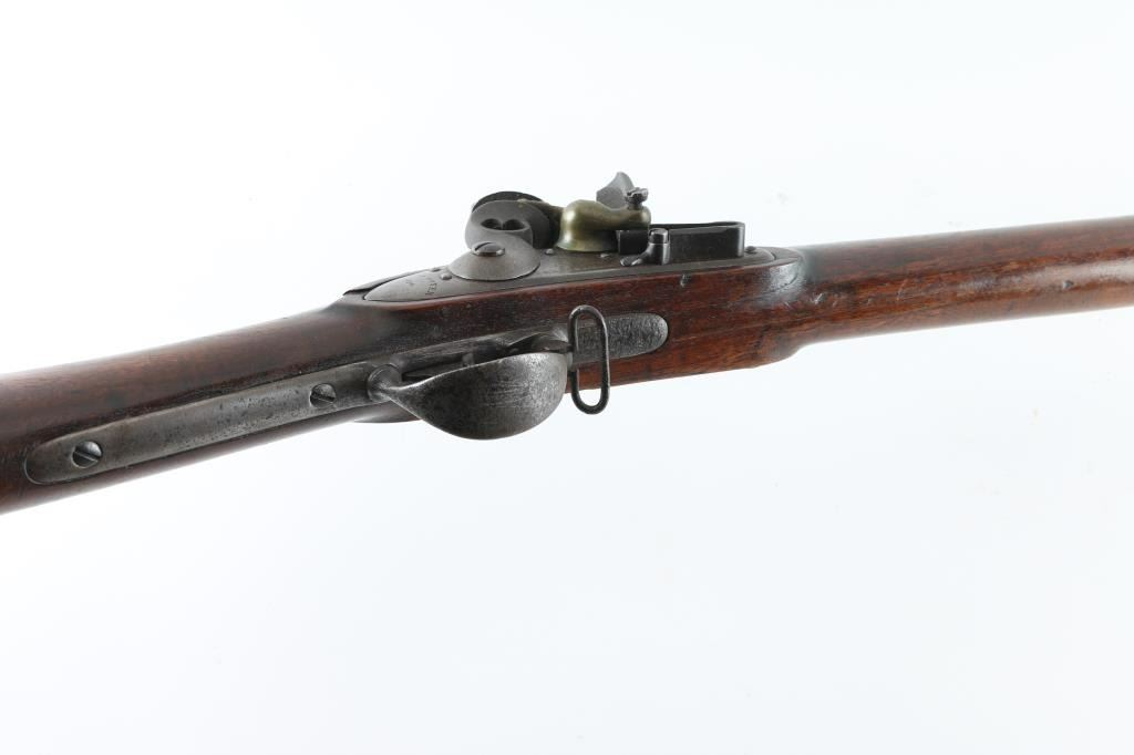 Flintlock musket marked US, P+ B W. Blake with New Haven and 1826 date on rear of lock. Barrel is marked US, JC, P, on left side of breech. All original parts with arsenal bright going to patina and some light erosion and pitting. Stock is V.G plus with "J.C." cartouche in oval on left side of stock, ramrod is about a inch short, A 7 1/2 plus inch 1-10 scale with a very nice stock. NRA. Very good plus overall. Note lock works well and screw shows minor marks. Antique Firearm