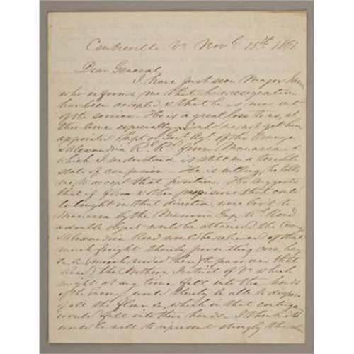 <B>P. G. T. BEAUREGARD AUTOGRAPH LETTER SIGNED TO GENERAL J. E. JOHNSTON, 1861.</B></I> Beauregard (1818-1893) was a Louisiana-born general for the Confederate Army during the American Civil War. He was also an author, civil servant, politician, and inventor. Beauregard was the first prominent Confederate general. He commanded the defenses of Charleston, South Carolina, for the Battle of Fort Sumter on April 12, 1861, and three months later was the victor at the First Battle of Bull Run near Manassas, Virginia. Beauregard entered the Confederate Army as a brigadier general in March 1861, but was promoted on July 21 to be one of the eventual eight full generals in the Confederate Army; his date of rank made him the fifth most senior general. He recommended stationing strong forces to protect New Orleans, but was overruled by President Davis. Hence began the friction between Beauregard and Davis that would intensify as years progressed.<BR><BR>P. G. T. Beauregard ALS “<I>G. T. Beauregard</B></I>”. Two pages, 7.75” x 9.75”. <I>n part "<I>Centreville, Va. Nov. 15th 1861. Dear General. I have just seen Major James who informed me that his resignation has been accepted & that he is now out of service. He is a great loss to me, at this time especiall</B></I>y <I>could not get him appointed via R. R. from Manassas & which I understand is still in a terrible State of confusion. He is willing, he tells me, to accept that position. He suggests that if ___ & other provisions that could be bought in that direction, were brought to Manassas by the Manassas Gap R. Road a double object…Should we ____ a moving rapidly to the assistance of the _____- batteries, could not be well to send there at once what to start first & find I believe that in a few days, with the balance of our force we could hold their place against any reasonable force of McClellan’s Grand Army. Should we determine to do so... Yours Truly </B></I>(Signed)<I> G. T. Beauregard</B></I>. "<BR><BR><B>Condition:</B></I> Very fine.<BR><BR><b>Shipping:</b> Flat Material, Small (<a target="_blank" href="http://www.heritageauctions.com/common/shipping.php">view shipping information</a>)