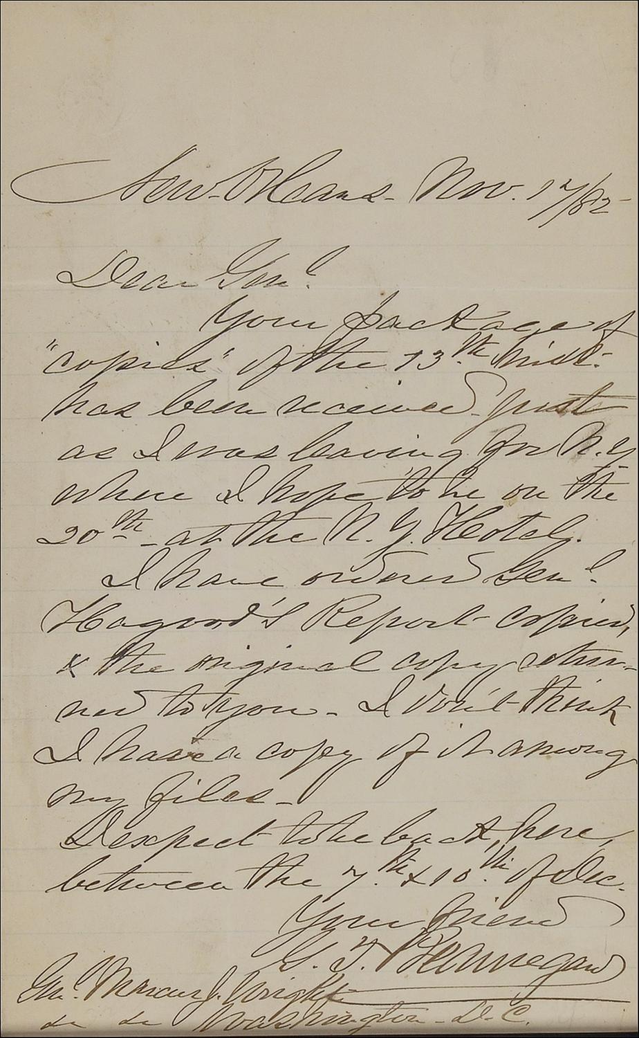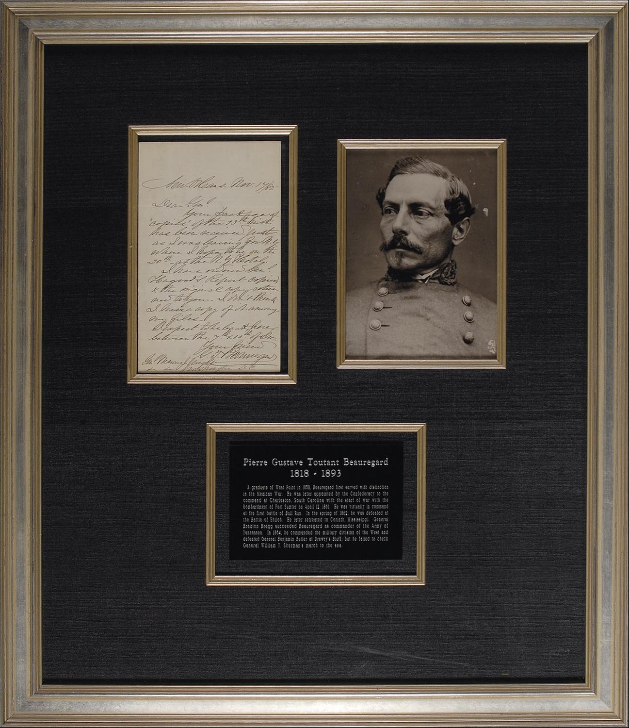 Brigadier General of the Confederate Provisional Army (1818–1893) who commanded the forces at Charleston, where he ordered the bombardment of Fort Sumter. ALS signed “G. T. Beauregard,” one page, lightly-lined, 5 x 8, November 17, 1882. Letter to General Wright. In part: “Your package of ‘copies’ of the 13th inst. Has been received. Just as I was leaving for N.Y. where I hope to be on the 20th at the N.Y. hotel. I have ordered Gen’l Hapgood’s report copied & the original copy…to you. I don’t think I have a copy of it among my files.” Cloth matted and framed with a portrait and a biographical plaque to an overall size of 22 x 25. In fine condition, with intersecting folds, a few light brushes to text, and a bit of mild toning and soiling. During these years, Beauregard and Jefferson Davis were engaged in a series of bitter published accusations and counter-accusations blaming each other for the Confederate defeat. Oversized.