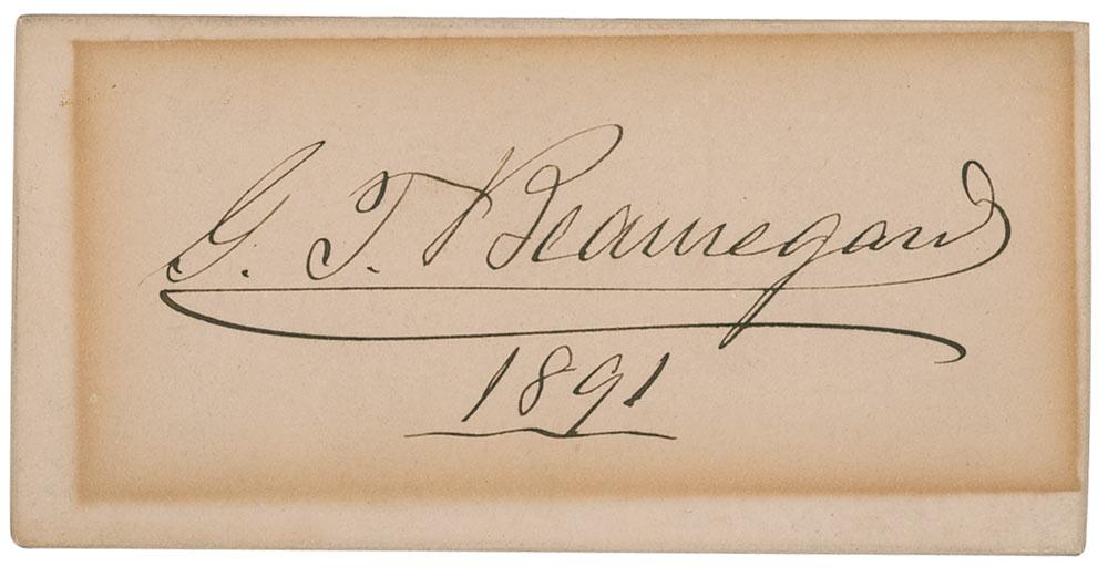 Ink signature, “G. T. Beauregard, 1891,” on an off-white 4 x 2 card. Uniform toning from previous display and mounting remnants to reverse, otherwise fine condition.