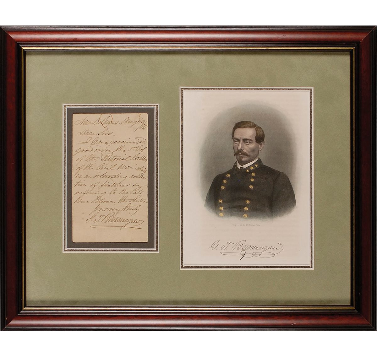 ALS signed “G. T. Beauregard,” one page, 3 x 5, August 24, 1884. Beauregard sends thanks for a Civil War book. In full, “I have received in good order, the 1st Vol of the ‘Pictorial Collection of the Civil War’ which is an interesting collection of pictures referring to the late War between the States.” Double suede matted and framed with a color engraved portrait of Beauregard to an overall size of 15 x 12.25. A vertical fold, a few rust marks along top edge, and a uniform shade of toning, otherwise fine condition.