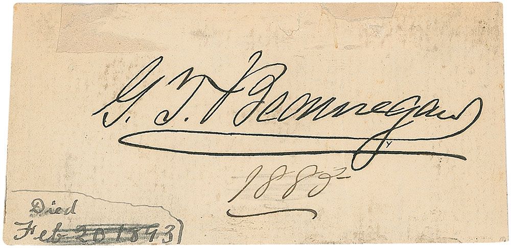 Ink signature, “G. T. Beauregard 1883,” on an off-white 4 x 2 card with a collector’s notation to lower left. In very good condition, with a vertical crease through a single letter of signature, scattered light soiling, surface loss and mounting remnants to top edge, and mounting remnants to reverse. Accompanied by an unsigned 5 x 7 glossy portrait.