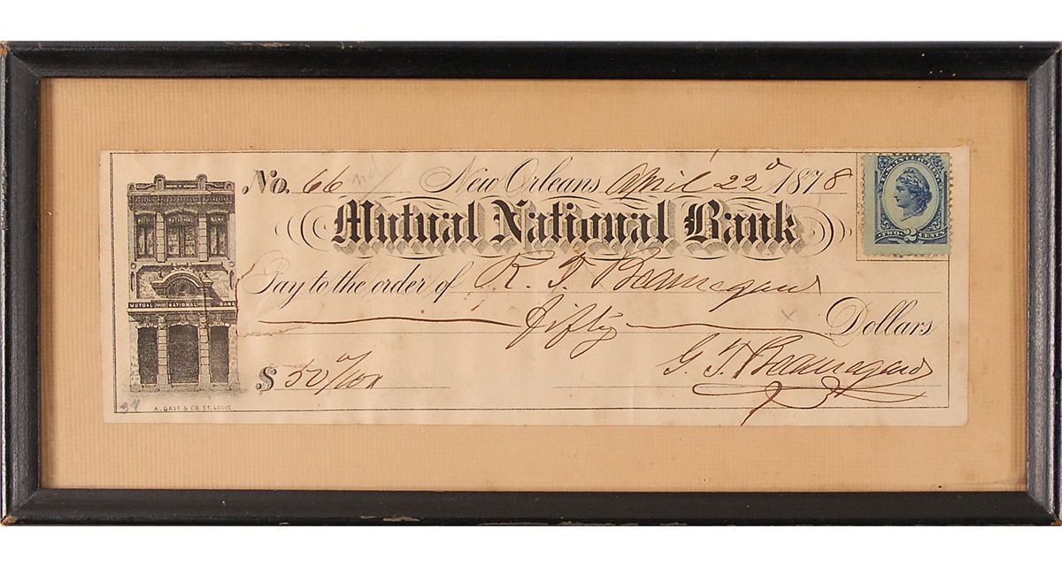 Bank check, 8.25 x 2.75, filled out and signed by Beauregard, “G. T. Beauregard,” payable to R. T. Beauregard for $50.00, April 22, 1878. A two-cent revenue stamp is affixed to top right corner. Framed to an overall size of 10.25 x 4.75. A couple of vertical folds, scattered toning and soiling, two cancellation cuts, a bit of light rippling, and a couple small pencil notations, otherwise very good condition.