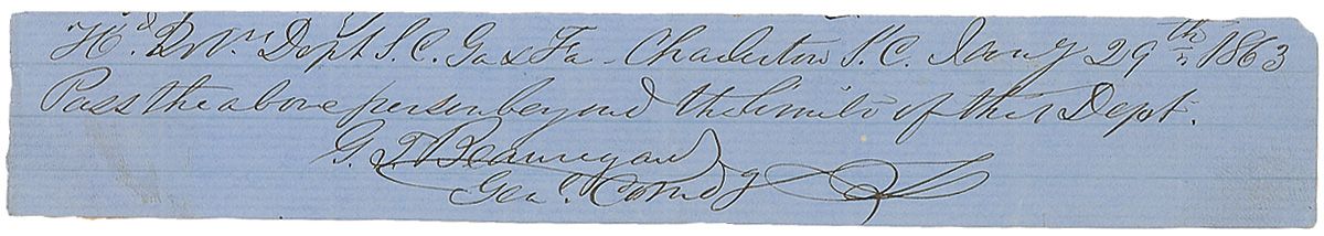 Brigadier General of the Confederate Provisional Army (1818–1893) who commanded the forces at Charleston, where he ordered the bombardment of Fort Sumter. Handwritten Civil War-dated endorsement signed “G. T. Beauregard, Genl. Comdg.,” on a blue 8 x 1.25 lightly-lined clipped slip, January 29, 1863. Beauregard references Charleston and writes, in part: “Pass the above person beyond the limits of this Dept.” Light toning and creasing, and show-through from mounting remnants to reverse, otherwise fine condition.