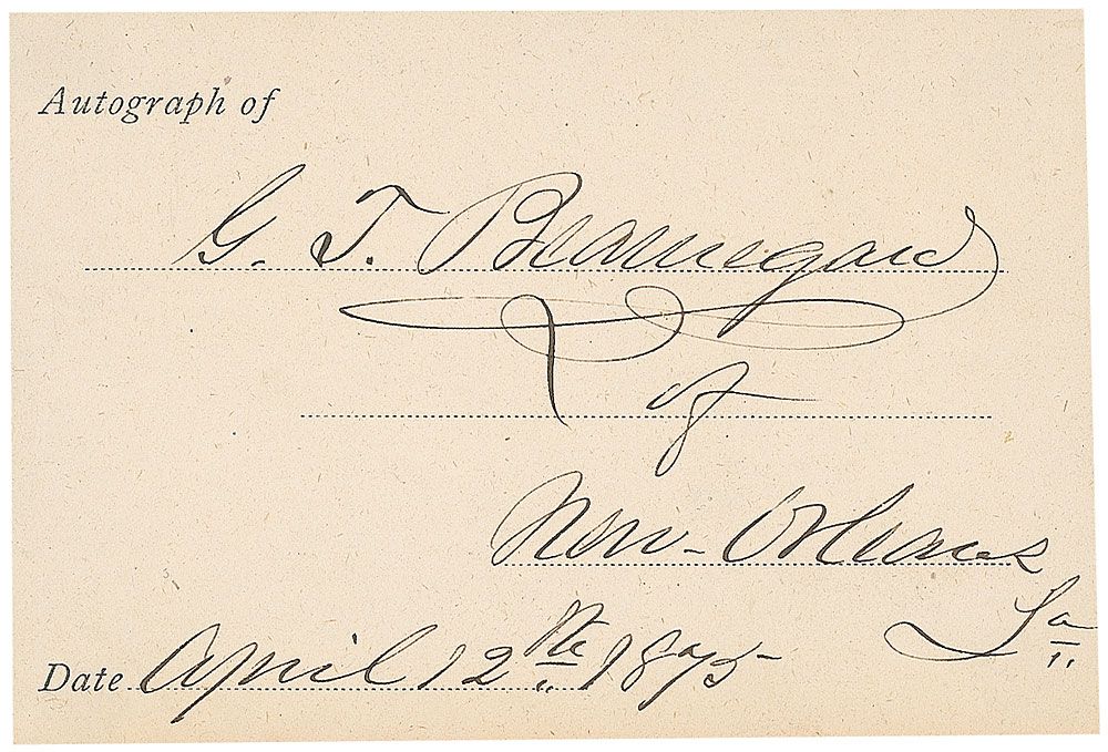Ink signature, “G. T. Beauregard of New Orleans, La., April 12th, 1875,” on an off-white 3.75 x 2.75 sheet affixed to a 4.75 x 3.5 card. In fine condition, with light impressions to corner tips.
