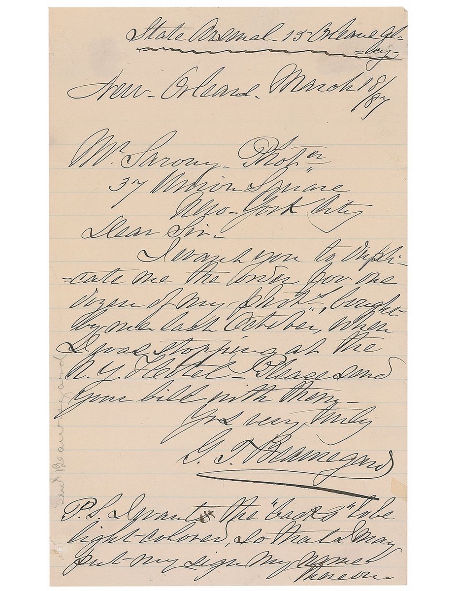 Brigadier General of the Confederate Provisional Army (1818–1893) who commanded the forces at Charleston, where he ordered the bombardment of Fort Sumter. ALS signed “G. T. Beauregard,” one page, lightly-lined, 5 x 8, March 18, 1887. Letter to “Sarony, Phot’er.” In part: “I want you to duplicate me the order for one dozen of my phot’s bought by me last October, when I was stopping at the N. Y. Hotel—Please send your bill with them. P. S. I want the ‘backs’ to be light colored, so that I may…sign my name thereon.” Light scattered creases to the top, some show-through from mounting remnants to reverse, and a pencil notation to left border, otherwise fine condition.