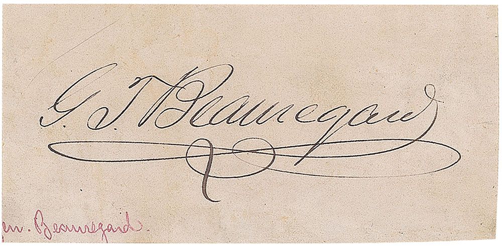Ink signature, “G. T. Beauregard,” on an off-white 3.25 x 1.5 slip affixed to a 5 x 3 card, with a small collector’s notation along bottom edge of slip. In fine condition, with some mild rippling, not affecting the crisp and dark signature.