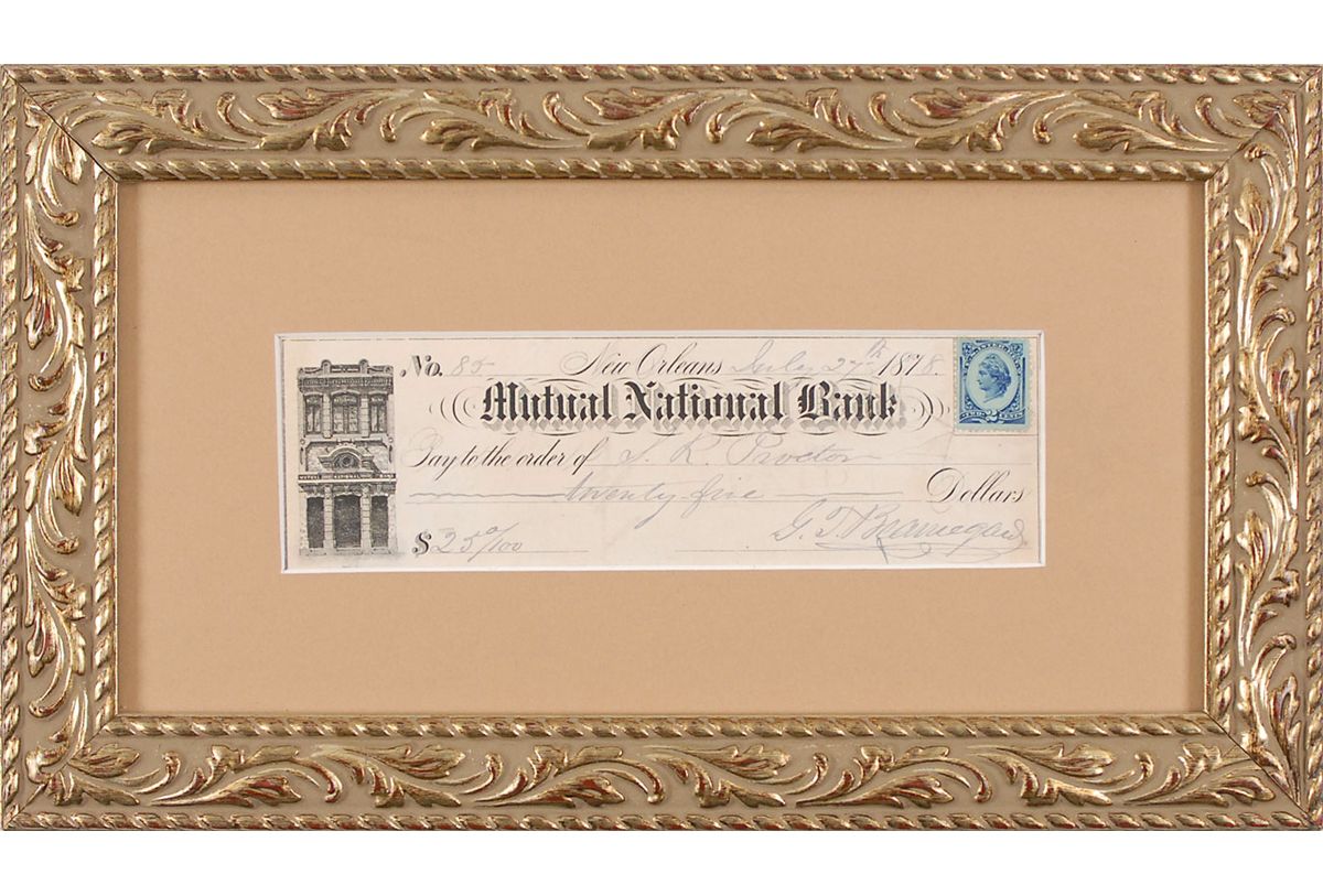 Bank check, 8 x 2.75, filled out in another hand and signed by Beauregard, “G. T. Beauregard,” payable to S. R. Proctor for $25.00, July 27, 1878. A two-cent revenue stamp is affixed to the top right corner. Matted and framed to an overall size of 14 x 8. A central vertical fold, expected stamps. A cancellation cut above signature, and light show-through from endorsement on reverse, otherwise fine condition.