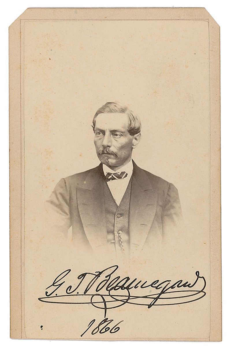 Brigadier General of the Confederate Provisional Army (1818–1893) who commanded the forces at Charleston, where he ordered the bombardment of Fort Sumter. Original 2.5 x 3.75 carte-de-visite photo by S. Anderson of New Orleans, signed below the image in black ink, “G. T. Beauregard 1866.” A trimmed bottom border and clipped top corner tips, otherwise fine condition.