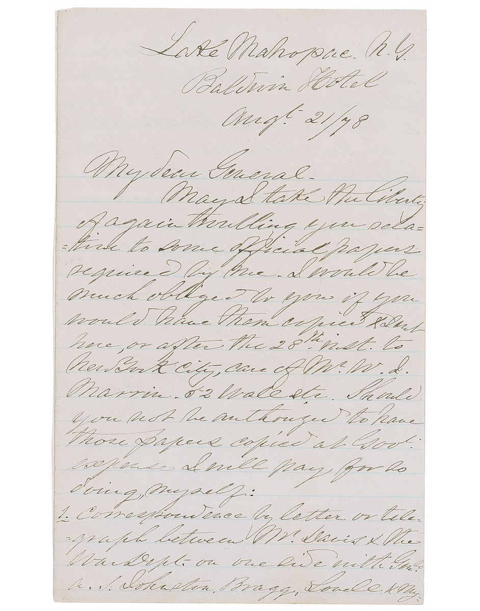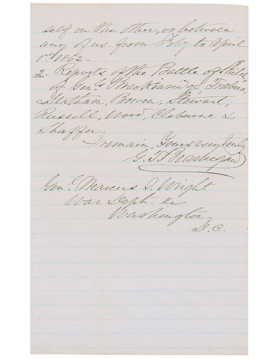 ALS signed “G. T. Beauregard,” one page, lightly-lined both sides, 5 x 8, August 21, 1878. Letter to General Marcus Wright. In part: “May I take the liberty of again troubling you relative to some official papers required by me…1. Correspondence by letter or telegraph between Mr. Davis & the War Dept. on one side with Genl’s A. S. Johnston, Bragg, Lovell & myself on the other, or between any of us…2. Report of the Battle of Shiloh of Genls. Breckenridge, Trabue, Statham.” In fine condition.