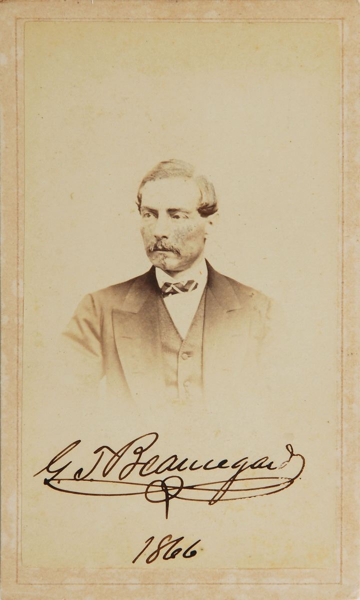 Seldom-seen 2.5 x 4.25 carte-de-visite head-and-shoulders portrait of Beauregard, signed in ink, “G. T. Beauregard, 1866.” Published by S. Anderson of New Orleans. In fine condition.