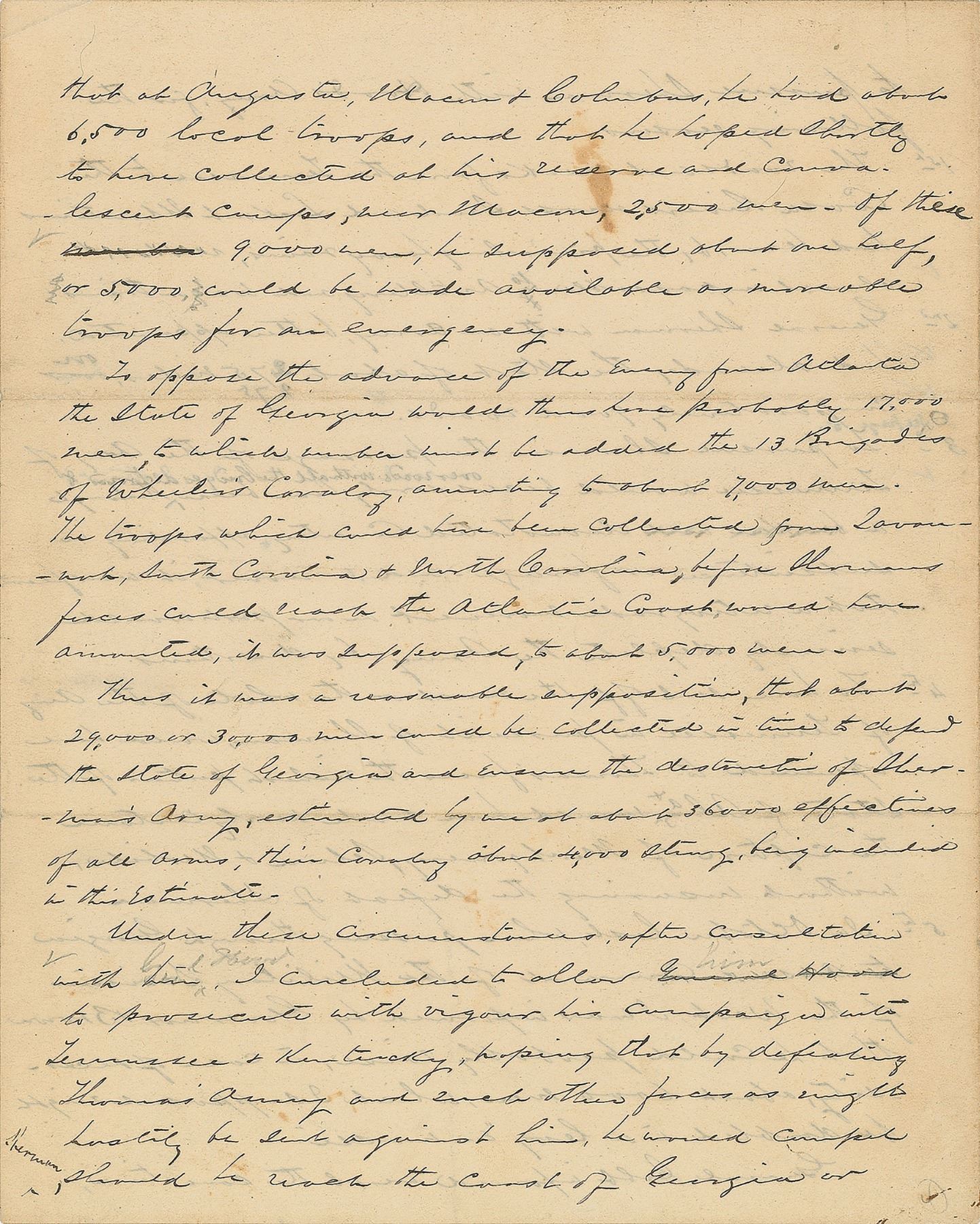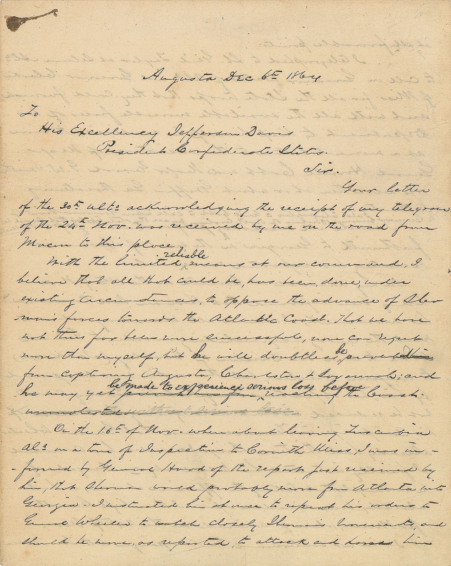 Under these circumstances, after consultation with him, I concluded to allow him to prosecute with vigour his campaign into Tennessee & Kentucky, hoping that by defeating Thomas’ army and such other forces as might hastily be sent against him, he would compel Sherman, should he reach the coast of Georgia or South Carolina, to repair at once to the defense of Kentucky & perhaps Ohio, and thus prevent him from reinforcing Grant: meanwhile supplies might be sent to Virginia from Middle & East Tennessee, thus relieving Georgia from the present constant drain upon its limited resources.” A postscript reads: “The transfer of Hoods Army into Georgia could not have been more expeditious by Railway than by marching through the country on account of the delays unavoidably resulting from the condition of the Rail Roads." In fine condition, with scattered small stains.