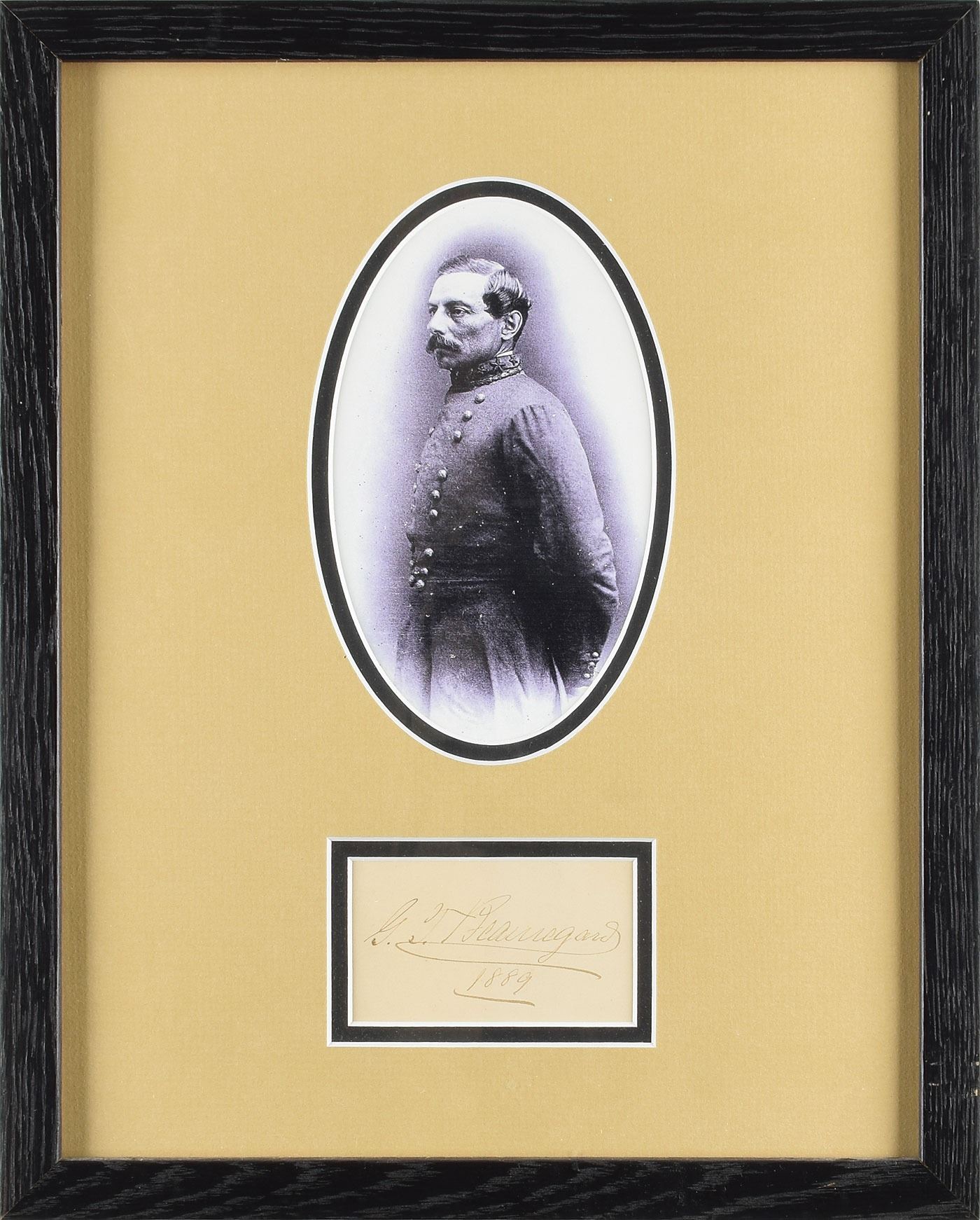 Ink signature, "G. T. Beauregard, 1889,” on an off-white 3.5 x 2 card. Double-matted and framed with an image of the Confederate general to an overall size of 12 x 15.25. In fine condition.