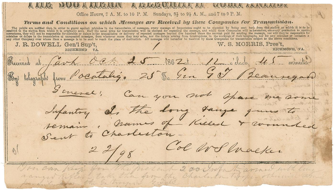 Brigadier General of the Confederate Provisional Army (1818–1893) who commanded the forces at Charleston, where he ordered the bombardment of Fort Sumter. War-dated ANS signed “G.T.B.,” one page, 8 x 4.5. Note written at the bottom of a telegram written to Beauregard from Colonel W. S. Walker dated October 25,1862, from Pocataligo, SC. Walker asks Beauregard “General: Can you not spare me some Infantry. Is the long range guns to remain. Names of killed and wounded sent to Charleston.” At the bottom in pencil, Beauregard writes: “You can keep for the present 200 Infantry armed with long ranged rifles, take them from the Charleston troops, otherwise take them from units from the Ga. Troops.” In very good condition, with Beauregard’s writing fairly light, but legible, vertical folds, scattered toning and soiling, and a trimmed top edge. Pre-certified PSA/DNA and RRAuction COA.