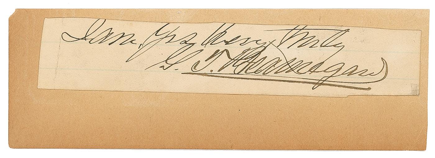 Fountain pen signature, “I am yours very truly, G. T. Beauregard,” on an off-white 4.5 x .75 lightly-lined slip cut from the close of a letter. Affixed to a slightly larger sheet. In very good condition, with vertical folds passing through his name, light toning, and slight rippling.