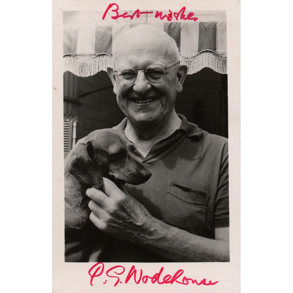 Glossy 3.5 x 5.5 photo of the English humorist with his dachshund, signed in red felt tip, "Best wishes, P. G. Wodehouse." In fine condition.