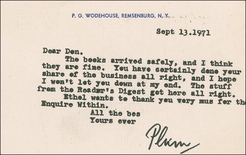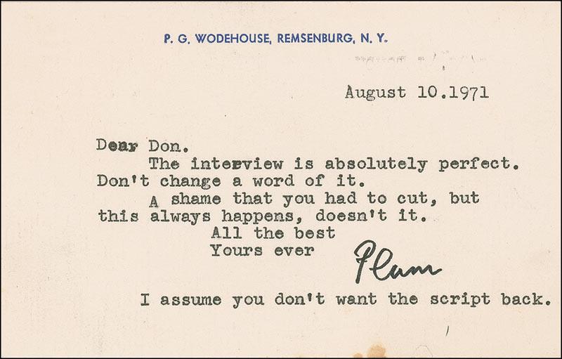 English humorist (1881–1975) whose work included novels, short stories, plays, poems, song lyrics, and numerous pieces of journalism. Two TLSs, signed “Plum,” each a 5.5 x 3.5 personal postcard, August 10 and September 13, 1971. Letter to a writer. One reads, in part: “The interview is absolutely perfect. Don’t change a word of it. A shame that you had to cut, but this always happens, doesn’t it.” Light toning, and a few spots of soiling and staining, otherwise fine condition.