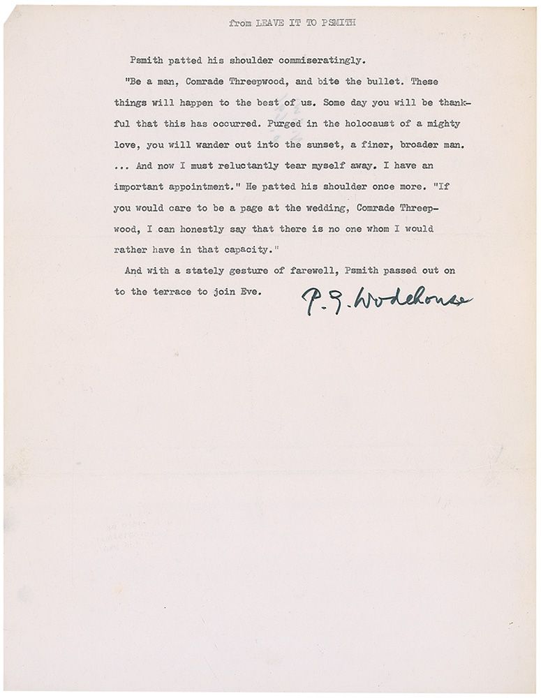 English humorist (1881–1975) whose work included novels, short stories, plays, poems, song lyrics, and numerous pieces of journalism. Souvenir typescript, one page, 8.5 x 11, from his comic novel Leave it to Psmith, signed at the conclusion in black felt tip. In fine condition, with light scattered creases.