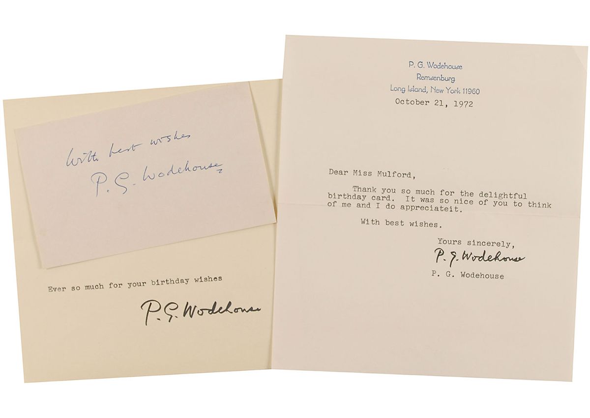 Three items: one brief TLS expressing thanks, one page, 6.25 x 7, personal letterhead, October 21, 1972; one thank-you card, 6 x 3, signed inside in black felt tip; and one ballpoint signature, “With best wishes, P. G. Wodehouse,” on an off-white 5 x 3 ca