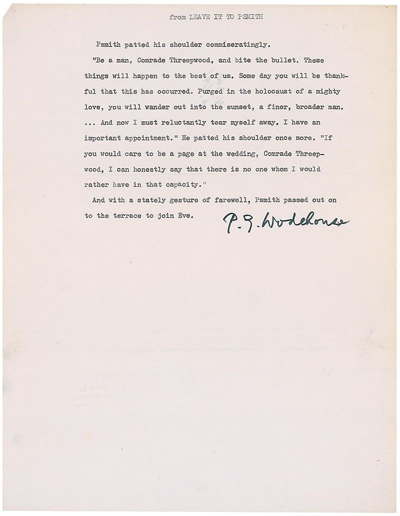English humorist (1881–1975) whose work included novels, short stories, plays, poems, song lyrics, and numerous pieces of journalism. Souvenir typescript, one page, 8.5 x 11, from his comic novel Leave it to Psmith, signed at the conclusion in black felt tip. In fine condition, with light scattered creases.