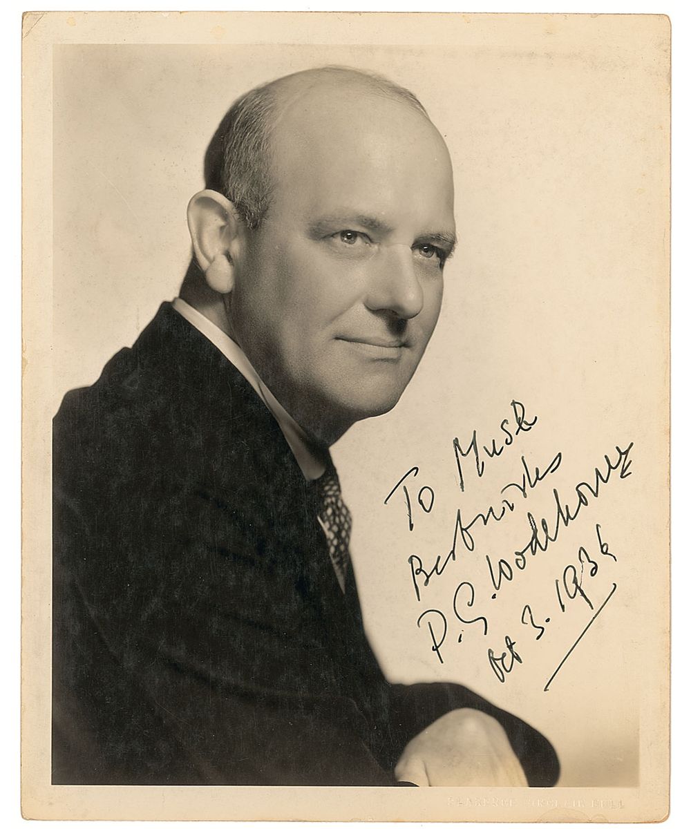 Vintage glossy 8 x 10 portrait of Wodehouse in a suit and tie, signed and inscribed in fountain pen, “To Mush, Best wishes, P. G. Wodehouse, Oct 3, 1936.” Blindstamped in the lower right by Clarence Sinclair Bull, with his photographer’s stamp to reverse, as well as the collector’s notation about where it was obtained: “20th Century, Grand Central, Sat. Oct. 3, 1936.” In fine condition, with a crease to the upper left corner tip and some mild soiling. A terrific image much earlier than typically seen.