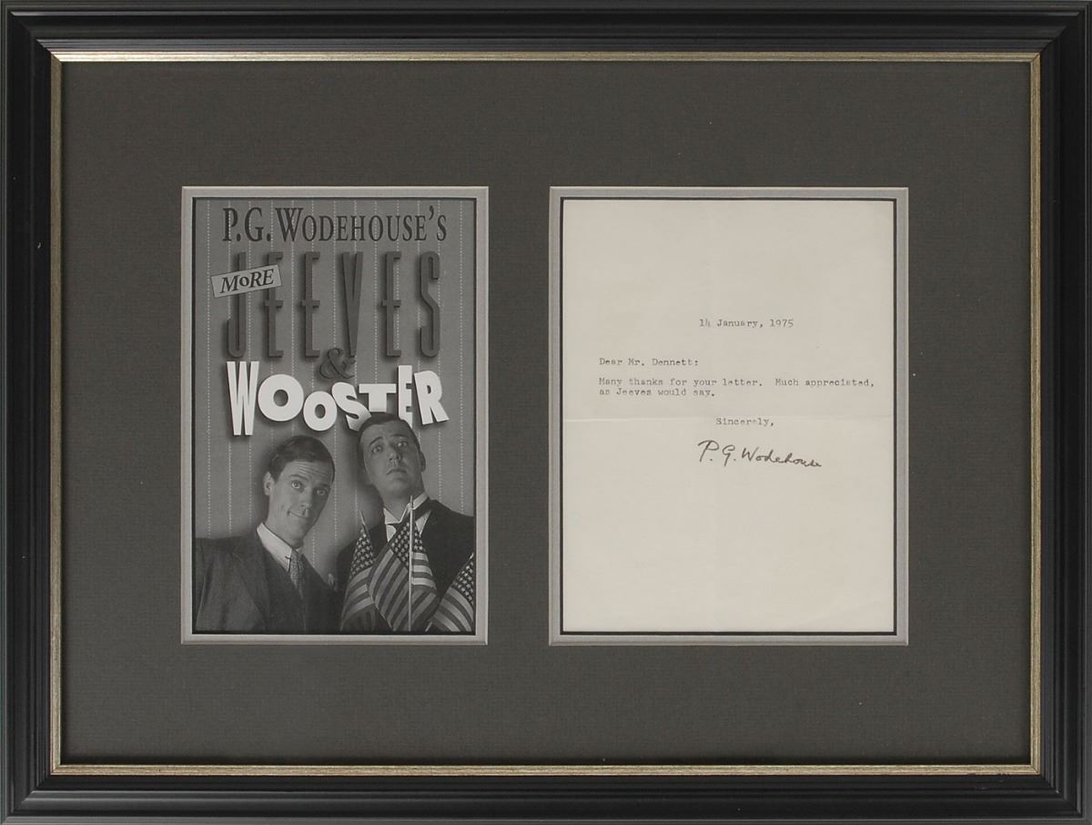 TLS, one page, 5.5 x 7.25, January 14, 1975. Letter to Mr. Dennett, in full: “Many thanks for your letter. Much appreciated, as Jeeves would say.” Double-matted and framed with a Jeeves and Wooster promo to an overall size of 18.5 x 14.25. In fine condition.
