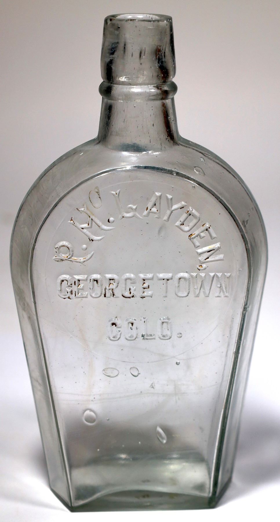 Preble W-85, although Preble misidentifies the "H" as an "M." Correct spelling verified through newspaper advertisements from 1887 (is Preble's date wrong too?). P.H. Layden, / Georgetown / Colo. 7.25" Clear glass coffin flask. Multiple bubbles, some haziness, small chip above "D". Please inspect.