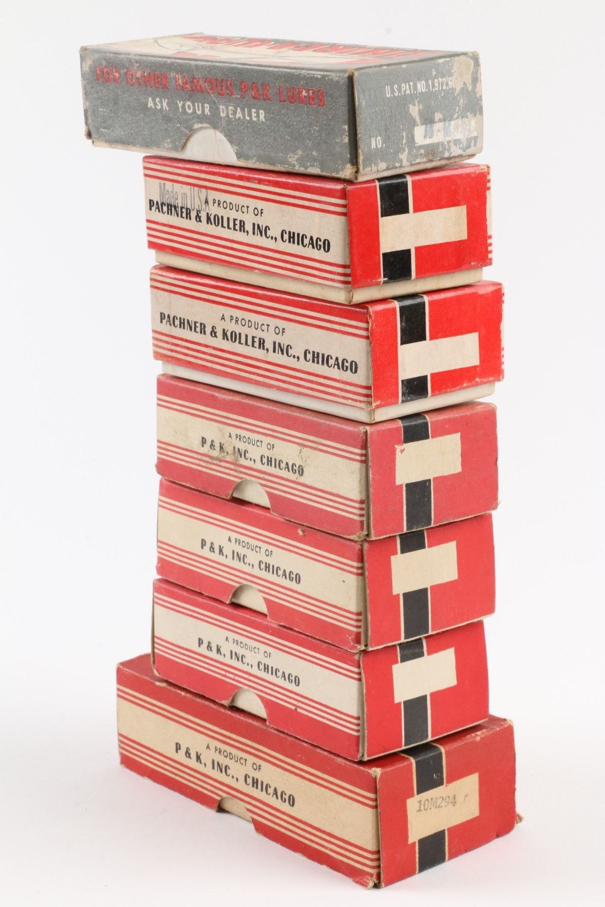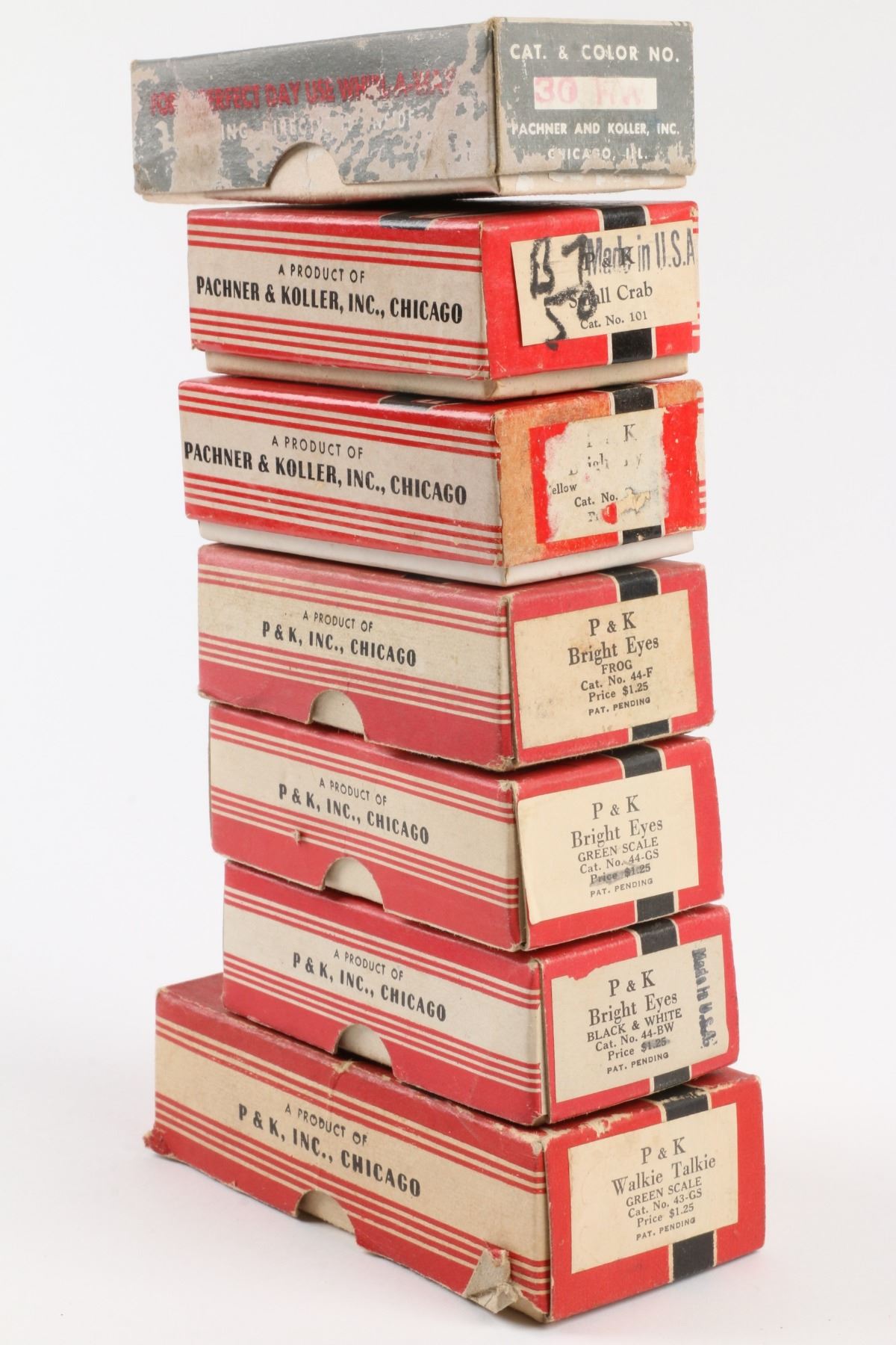 P&K Incorporated, United States. Boxed. Material: Mixed. Quantity: 7. Grade: VG+. 3.75" - 4.75" boxes. Est. $100-125.